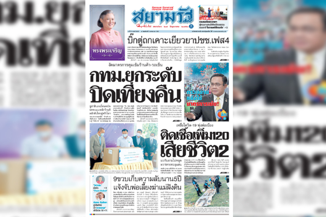 หน้า 1 หนังสือพิมพ์สยามรัฐรายวัน ฉบับวันพฤหัสบดีที่ 2 เม.ย. พ.ศ.2563 บิ๊กตู่ถกเคาะเยียวยาปชช.เฟส 4 https://siamrath.co.th/n/143795 กทม.ยกระดับปิดเที่ยงคืน https://siamrath.co.th/n/143796 ติดเชื้อเพิ่ม 120 เสียชีวิต 2 https://siamrath.co.th/n/143797 9 ขวบเก็บความลับนาน 5 ปีแจ้งจับพ่อเลี้ยงฆ่าแม่ฝังดิน https://siamrath.co.th/n/143798