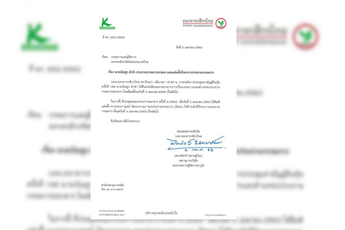 ธนาคารกสิกรไทย(KBANK)แจ้งว่า คณะกรรมการธนาคารกสิกรไทย ประกาศแต่งตั้งนางสาวขัตติยา อินทรวิชัย เป็นประธานเจ้าหน้าที่บริหาร ธนาคารกสิกรไทย ซึ่งจะเป็นประธานเจ้าหน้าที่บริหารหญิงคนแรกของธนาคาร และเป็นคนแรกที่ไม่ใช่ตระกูลล่ำซำ มีผลตั้งแต่วันที่ 3 เมษายน 2563 เป็นต้นไป และภายหลังการประชุมสามัญผู้ถือหุ้น ครั้งที่ 108 นายบัณฑูร ล่ำซำ ได้ขอลาออกจากตำแหน่งกรรมการและประธานกรรมการ ธนาคารกสิกรไทย ต่อคณะกรรมการธนาคาร มีผลตั้งแต่วันที่ 3 เมษายน 2563 เป็นต้นไป ทั้งนี้ ที่ประชุมคณะกรรมการธนาคารมีมติแต่งตั้งให้นางกอบกาญจน์ วัฒนวรางกูร รองประธานกรรมการ (อิสระ) เป็นรักษาการประธานกรรมการ ซึ่งหากได้รับความเห็นชอบจากธนาคารแห่งประเทศไทย จะเป็นประธานกรรมการที่เป็นกรรมการอิสระคนแรกของธนาคาร โดย นางสาวขัตติยา อินทรวิชัย และ นางกอบกาญจน์ วัฒนวรางกูร จะพูดคุยทางออนไลน์กับสื่อมวลชนในวันที่ 7 เมษายน 2563 และนายบัณฑูร ล่ำซำ จะพูดคุยทางออนไลน์กับสื่อมวลชนในวันที่ 8 เมษายน 2563