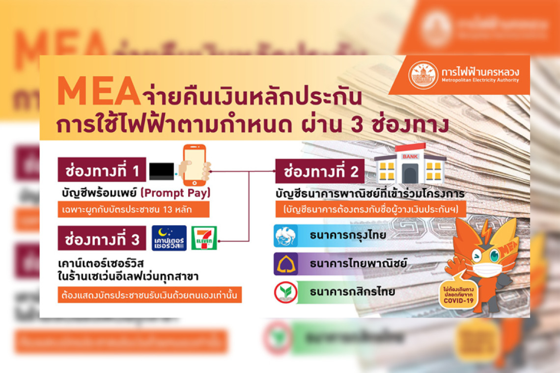 ตามที่การไฟฟ้านครหลวง หรือ MEA ได้เปิดให้มีการลงทะเบียนขอคืนเงินประกันการใช้ไฟฟ้าผ่านช่องทางออนไลน์ และหมายเลขโทรศัพท์ 0 2256 3333 ตั้งแต่วันที่ 25 มีนาคม เป็นต้นไปนั้น MEA ได้ดำเนินการคืนเงินตั้งแต่วันที่ 30 มี.ค. 63 จนกระทั่งล่าสุดในวันที่ 1 เม.ย. 63 มีผู้ได้รับเงินแล้วทั้งสิ้นประมาณ 181,000 ราย คิดเป็นจำนวนทั้งสิ้นกว่า 465 ล้านบาท โดยช่องทางคืนเงินที่ได้รับมากที่สุดคือพร้อมเพย์ ส่วนช่องทางโอนบัญชีธนาคาร และเคาน์เตอร์เซอร์วิส เป็นช่องทางที่ได้รับเงินคืนรองลงมาตามลำดับ