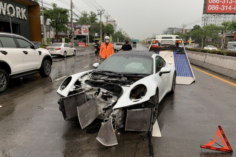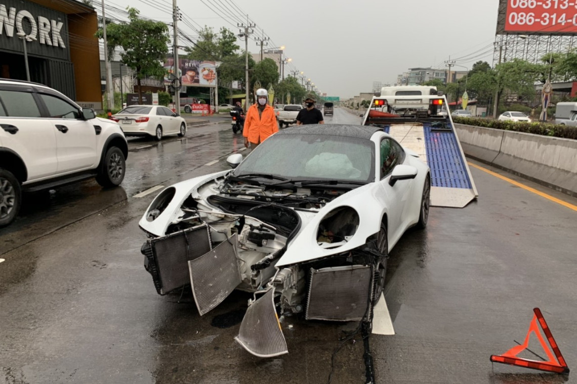 เมื่อเวลา 16.00 น.วันที่ 13 เม.ย.63 พ.ต.ต.วิทยา คงทองสว.(สอบสวน)สน.โคกคราม ได้รับแจ้งมีอุบัติเหตุรถสปอร์ตยี่ห้อปอร์เช่ ป้ายแดง เสียหลักชนเสาไฟข้างทาง ที่บริเวณถนนเกษตร-นวมินทร์ ขาเข้า หน้าโรงเรียนเลิศหล้า จึงรุดไปตรวจสอบพร้อมเจ้าหน้าที่อาสามูลนิธิร่วมกตัญญู ที่เกิดเหตุอยู่บริเวณถนนเกษตร-นวมินทร์ ขาเข้า ช่วงตอหม้อที่ 239 พบรถเก๋งยี่ห้อปอร์เช่ สีขาว ป้ายแดง หมายเลข พ 9999 กรุงเทพมหานคร จอดอยู่กลางถนน ด้านหน้าพังเสียหายยับ กันชนหลุดหน้ายุบ ไฟหน้าแตก ชิ้นส่วนกระจัดกระจายเกลื่อนเต็มถนน และเสาไฟฟ้าข้างทางหักโค้นพังเสียหาย ตรวจสอบในรถพบผู้บาดเจ็บ 2 ราย คือนายพงศ์พัฒน์ วัฒนศรี อายุ 32 ปี คนขับ และ น.ส.จิตวดี กิจประยูร อายุ 43 ปี มีอาการบาดเจ็บแน่นหน้าอกเจ้าหน้าที่มูลนิธิร่วมกตัญญู จึงเร่งนำตัวส่ง รพ.พญาไท นวมินทร์ พ.ต.ต.วิทยา กล่าวว่า รถยนต์คันดังกล่าวได้ขับมาตามถนนเกษตร-นวมินทร์ ขาเข้าเมื่อมาถึงบริเวณหน้าโรงเรียนเลิสหล้า รถเกิดเสียหลักเนื่องจากถนนลื่นจนรถหมุนไปฟาดกับเสาไฟฟ้าข้างทางได้รับความเสียหาย เบื้องต้นมีผู้บาดเจ็บ 2 ราย แต่ไม่มีผู้เสียชีวิต โดยหลังจากที่ผู้ขับขี่รถคันดังกล่าว ออกจากโรงบาลแล้วจะเรียกมาทำการเปรียบเทียบปรับในข้อหาขับรถประมาททำให้ทรัพย์สินราชการเสียหาย จากนั้นจึงให้ทางประกันดำเนินการชดใช้ค่าเสียหายกับทางราชการต่อไป