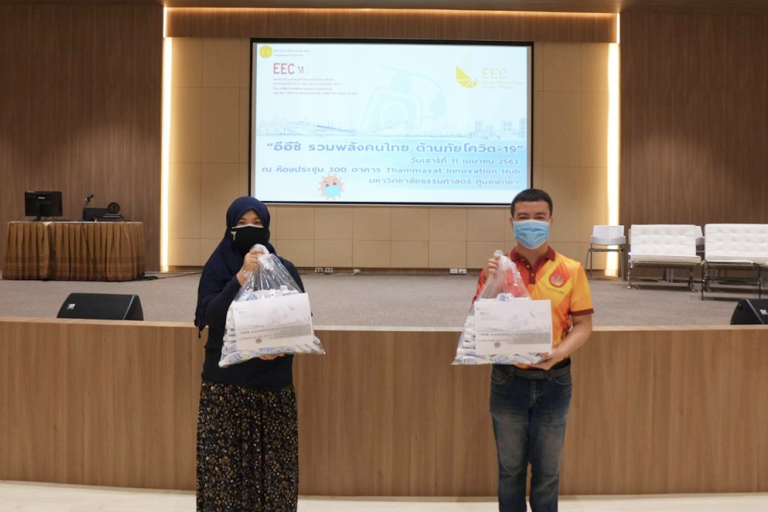 มหาวิทยาลัยธรรมศาสตร์ (มธ.) ศูนย์พัทยา ร่วมกับสำนักงานคณะกรรมการนโยบายเขตพัฒนาพิเศษภาคตะวันออก (สกพอ.) จัดทำโครงการ “อีอีซี รวมพลังคนไทย ต้านภัยโควิด-19” โดยได้ผลิตเจลแอลกอฮอล์และหน้ากากอนามัย เพื่อมอบให้กับประชาชนในพื้นที่เขตพัฒนาพิเศษภาคตะวันออก 3 จังหวัด ได้แก่ ชลบุรี ระยอง และฉะเชิงเทรา โดยมี ดร.ณัฐดนย์ พรรณุเจริญวงษ์ ผู้ช่วยอธิการบดีฝ่ายบริหารศูนย์พัทยา มธ. และ น.ส.ทัศนีย์ เกียรติภัทราภรณ์ รองเลขาธิการสายงานพัฒนาพื้นที่และชุมชน สกพอ. เป็นตัวแทนเปิดโครงการ
