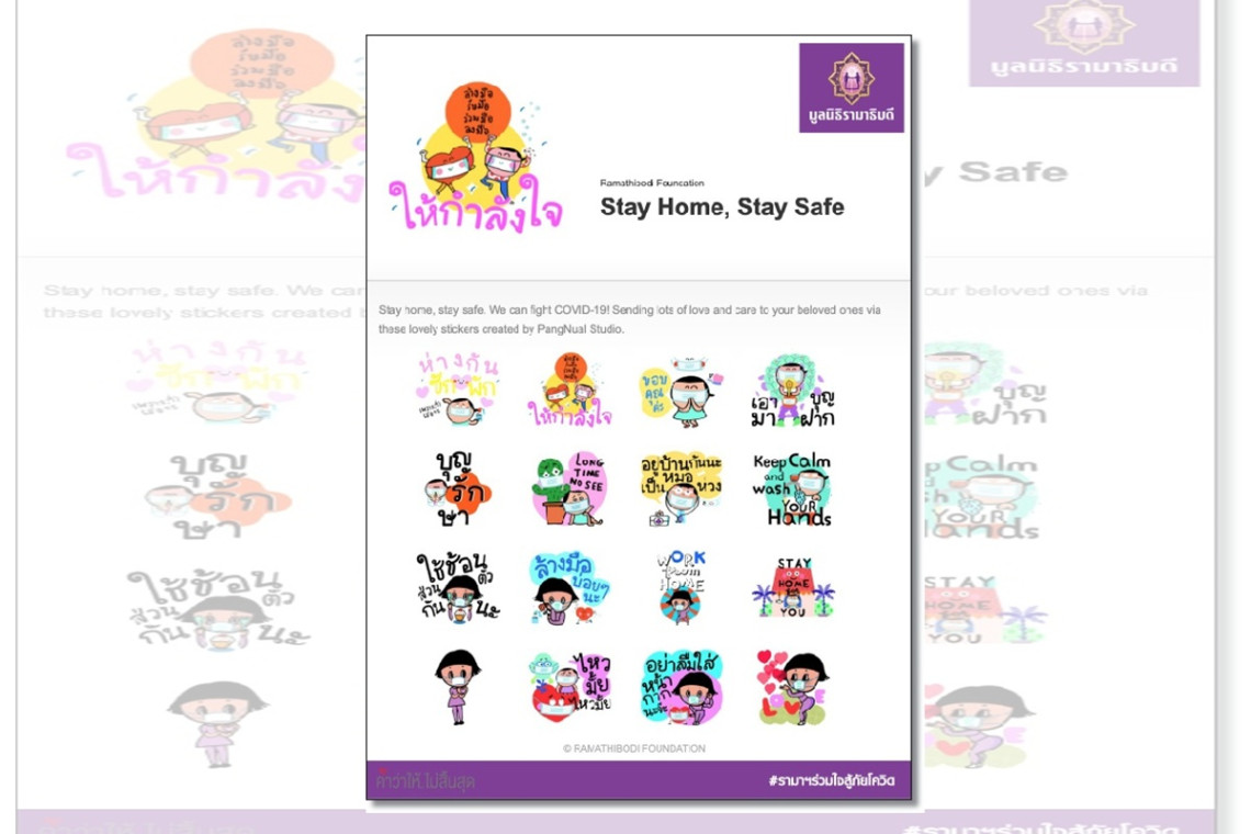 มูลนิธิรามาธิบดีฯ ส่งสติ๊กเกอร์ ส่งความห่วงใย... เพราะกำลังใจเป็นสิ่งสำคัญ โดยได้ 2 พี่น้องสายอาร์ต “แป้ง” ภัทรีดา และ “นวล” นวลตอง ประสานทอง อาสาออกแบบสติ๊กเกอร์ไลน์สุดพิเศษ “Stay Home, Stay Safe” ให้กับมูลนิธิรามาธิบดีฯ มาร่วมส่งกำลังใจให้คนรอบข้างที่จำเป็นต้องห่างกันในระยะนี้ด้วยสติ๊กเกอร์ไลน์มูลนิธิรามาธิบดีฯ ในราคา 30 บาท รายได้ทั้งหมดสมทบทุนซื้อเครื่องมือแพทย์รักษผู้ป่วยโควิด-19