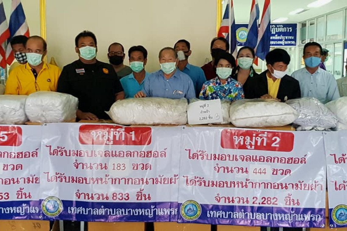 วันที่ 15 เม.ย.63 “ที่เทศบาลตำบลบางหญ้าแพรก หมู่ 1 ต.บางหญ้าแพรก อ.เมือง” นายเรียน หงษ์คู นายกเทศมนตรีบางหญ้าแพรก อ.เมืองสมุทรสาคร ได้จัดพิธีโครงการส่งมอบสิ่งของวัสดุเพื่อป้องการเชื้อโรคโควิด-19 ให้กับบรรดาผู้นำชุมชน รวม 6 ในเขตดูแล ซึ่งประกอบด้วย หน้ากากอนามัยผ้า และเจลแอลกอฮอล์ จำนวน 45,000 ชิ้น และเจลแอลกอฮอล์ จำนวน 10,000 โดยมีกำนันและผู้ใหญ่บ้าน ในเขตพื้นที่มาร่วมกันรับมอบ มีนางจันทร์เพ็ญ เจนกิจณรงค์ ปลัดเทศบาลตำบลบางหญ้าแพรก พร้อมสมาชิกสภาฯ เข้าร่วมงานให้การต้อนรับในฐานะสักขีพยาน นายเรียน หงษ์คู นายก ทต.บางหญ้าแพรก เปิดเผยว่า สำหรับการจัดมอบหน้ากากอนามัยผ้า และเจลแอลกอฮอล์ล้างมือ ครั้งนี้โดยให้ผู้นำชุมชนเพื่อไปช่วยนำไปแจกจ่ายกระจายสู่ประชาชนได้อย่างทั่วถึง ซึ่งทางเทศบาลนั้นมีเขตดูแลลูกบ้านจำนวน 6 หมู่ เป็นหน้ากากอนามัยผ้า จำนวน 45,000 ชิ้น และเจลแอลกอฮอล์อีก 10,000 ขวด แจกครัวเรือนละ 1 ขวด เพื่อป้องกันการแพร่ระบาดของโรค ตามมาตรการป้องกันและลดความเสี่ยงของโรคไวรัสโคโรนา (หรือโควิด-19) ทั้งนี้ขอให้ให้ประชาชนได้อุ่นใจ และใช้ชีวิตประจำวันอยู่อย่างมีความสุข ซึ่งทางเจ้าหน้าที่จะเร่งดำเนินการไล่แจกในทุกพื้นที่จนครบให้ถึงมือประชาชนทั้งตำบลบางหญ้าแพรก โดยเร็วที่สุด