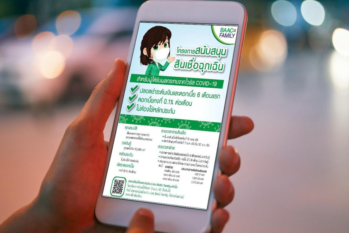 รายงานข่าวแจ้งว่า จากการที่ธนาคารเพื่อการเกษตรและสหกรณ์การเกษตร (ธ.ก.ส.)ได้เปิดลงทะเบียนเงินกู้ฉุกเฉินเพื่อเป็นค่าใช้จ่ายสำหรับผู้ที่ได้รับผลกระทบจากไวรัสโคโรนา (COVID-19)ผ่านระบบ LINE Official BAAC Family ณ วันที่ 18 เม.ย.63 เวลา 17.00 น.จำนวน 1,214,699 ราย วงเงินกู้ 12,140 ล้านบาท  ทั้งนี้โครงการเงินกู้ดังกล่าว ธ.ก.ส. ได้กำหนดกลุ่มเป้าหมายคือกลุ่มเกษตรกรและครอบครัวของเกษตรกร ซึ่งธนาคารฯ กำหนดเงินไขการให้สินเชื่อต่อรายไม่เกิน 10,000 บาท คิดอัตราดอกเบี้ยเพียงร้อยละ 0.1 ต่อเดือน ชำระคืนไม่เกิน 2 ปี 6 เดือนนับจากวันกู้