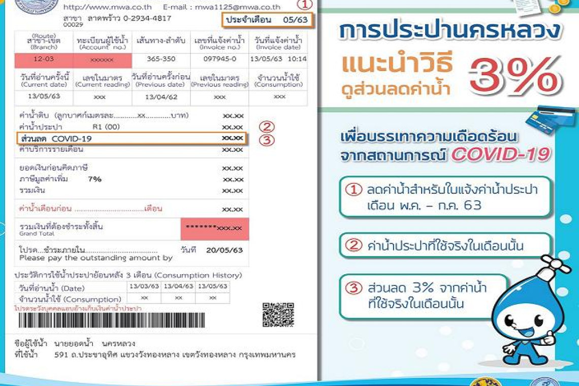 ลดให้กับผู้ใช้น้ำทุกประเภท ตั้งแต่ พ.ค.-มิ.ย. และก.ค.นี้ รับสิทธิได้โดยอัตโนมัติ ไม่ต้องมีลงทะเบียนใดๆ ให้ยุ่งยาก การประปานครหลวง (กปน.) ลดค่าน้ำ 3 % เป็นเวลา 3 เดือน ตามมาตรการบรรเทาความเดือดร้อนและแบ่งเบาภาระค่าใช้จ่ายของประชาชน ในช่วงการแพร่ระบาดของโรคติดเชื้อไวรัสโคโรนา (COVID – 19 ) ให้กับผู้ใช้น้ำทุกประเภท สำหรับใบแจ้งค่าน้ำประปาของเดือนพฤษภาคม มิถุนายน และกรกฎาคม 2563 ซึ่ง กปน. จะให้ส่วนลดค่าน้ำประปากับผู้ใช้น้ำทุกราย 3 % ทันที โดยไม่ต้องลงทะเบียนเพื่อรับสิทธิ์นี้ ทั้งนี้ กปน. จะแจ้งส่วนลดค่าน้ำประปา 3 % ในใบแจ้งค่าน้ำประปาของเดือนพฤษภาคม มิถุนายน และกรกฎาคม 2563 ซึ่งจะมีข้อความว่า “ส่วนลด (COVID-19)” ตามด้วยส่วนลดค่าน้ำประปาในเดือนนั้น สามารถสอบถามข้อมูลเพิ่มเติมได้ที่ MWA call center โทร.1125 ตลอด 24 ชั่วโมง หรือ ทาง Line Official Account : @MWAthailand