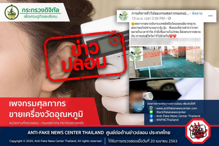 ข่าวปลอม อย่าแชร์! ❌ เพจกรมศุลกากร ขายเครื่องวัดอุณหภูมิ . ตามที่มีข้อความกล่าวอ้าง เกี่ยวกับประเด็นเรื่อง เพจกรมศุลกากร ขายเครื่องวัดอุณหภูมิ ทางศูนย์ต่อต้านข่าวปลอมได้ดำเนินการตรวจสอบข้อเท็จจริงกับทาง กรมศุลกากร กรมศุลกากร กระทรวงการคลัง พบว่าประเด็นดังกล่าวนั้น เป็นข้อมูลเท็จ . จากกรณีที่มีเพจใช้ชื่อกรมศุลกากร ขายเครื่องวัดอุณหภูมิ โดยระบุว่า ศุลกากรสนามบินกรุงเทพยึดปืนวัดอุณหภูมิจำนวนมาก ตอนนี้ขายต่ำกว่าราคาตลาดในเวลาปัจจุบัน ทางกรมศุลกากรได้ชี้แจงถึงประเด็นนี้ว่าไม่เป็นความจริงโดยได้แจงรายละเอียดเป็น 3 ประเด็น ได้แก่ . 1. การประกาศขายเครื่องวัดอุณหภูมิตามเพจดังกล่าว ไม่ใช่เครื่องวัดอุณหภูมิที่กรมศุลกากรได้ทำการยึดไว้แต่อย่างใด เนื่องจากการดำเนินงานในปัจจุบัน เมื่อกรมศุลกากรตรวจยึดเครื่องวัดอุณหภูมิไว้แล้ว จะต้องส่งมอบให้ศูนย์บริหารสถานการณ์การแพร่ระบาดของโรคติดเชื้อไวรัสโคโรนา 2019 (โควิด-19) หรือ (ศบค.) ของรัฐบาล โดยไม่มีการจำหน่ายตามสื่อออนไลน์ . 2. ภาพที่ทางเพจดังกล่าวได้นำมาใช้นั้น ไม่ใช่ภาพจากกรมศุลกากร . 3. เพจดังกล่าว ไม่ได้เป็นสื่อภายใต้การกำกับดูแลของกรมศุลกากร และมีการนำตราสัญลักษณ์ (โลโก้) ของโครงการที่อยู่ภายใต้การดำเนินงานของกรมศุลกากรไปใช้เพื่อสร้างความน่าเชื่อถือ และหาผลประโยชน์ทางธุรกิจซึ่งถือเป็นการหลอกลวงประชาชน . ดังนั้นขอให้ประชาชนอย่าหลงเชื่อข้อมูลดังกล่าว และขอความร่วมมือไม่ส่ง หรือแชร์ข้อมูลดังกล่าวต่อในช่องทางสื่อสังคมออนไลน์ต่างๆ และเพื่อให้ประชาชนได้รับข้อมูลข่าวสารจากกรมศุลกากร สามารถติดตามได้ที่ www.customs.go.th หรือโทร 02 6676000 . บทสรุปของเรื่องนี้คือ : ไม่จริง ไม่ควรแชร์ต่อ ❌ . หน่วยงานที่ตรวจสอบ : กรมศุลกากร กระทรวงการคลัง . ? ช่องทางการติดตาม . LINE : @antifakenewscenter (http://nav.cx/uyKYnsG) Website : https://www.antifakenewscenter.com/ Twitter: https://twitter.com/AFNCThailand . #ข่าวปลอม #อย่าแชร์ต่อ #ศูนย์ต่อต้านข่าวปลอม #AntiFakeNewsCenter #AFNCThailand #โควิด19 #COVID19 #เครื่องวัดอุณหภูมิ #ศบค #ศุลกากร