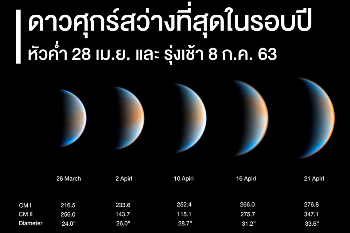 NARIT ชวนชม ดาวศุกร์สว่างที่สุด 2 ครั้งในรอบปี ช่วงค่ำวันที่ 28 เมษายน 2563 เวลาประมาณ 18:30-21:00 น. และ รุ่งเช้าวันที่ 8 กรกฎาคม 2563 ก่อนดวงอาทิตย์ขึ้น เวลาประมาณ 03:30-06:00 น. วันดังกล่าวจะสังเกตเห็นดาวศุกร์สว่างสุกใส ดูได้ด้วยตาเปล่าอย่างชัดเจนทั่วประเทศ คาดว่าจะมีค่าอันดับความสว่างปรากฏถึง -4.6 (ดวงจันทร์เต็มดวงมีค่าอันดับความสว่างปรากฏ -12.6) และหากสังเกตผ่านกล้องโทรทรรศน์ดาวศุกร์จะปรากฏเป็นเสี้ยวคล้ายดวงจันทร์