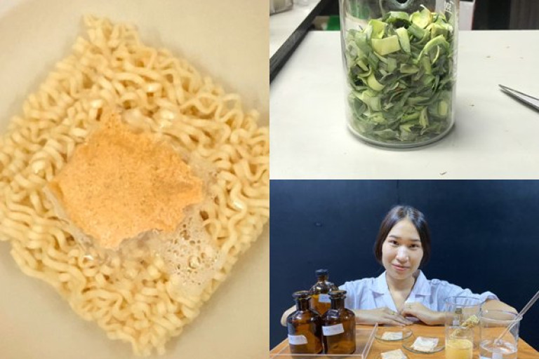 ทั้งนี้ ใบสับปะรดมีองค์ประกอบหลัก สำหรับเป็นเยื่อเซลลูโลสคุณภาพสูง (Alpha Cellulose) เหมาะสมในการนำมาดัดแปรเป็นฟิล์มคาร์บอกซีเมทิลเซลลูโลส (carboxymethyl cellulose หรือ CMC) ซึ่งเป็นฟิล์มที่ย่อยสลายได้ด้วยวิธีทางชีวภาพ และสามารถรับประทานได้ ตนจึงได้ศึกษาการผลิตซองเครื่องปรุงรสของบะหมี่กึ่งสำเร็จรูปที่ทำจากฟิล์ม CMC ด้วยการนำใบสับปะรดมาทำการดัดแปรให้เป็นฟิล์ม