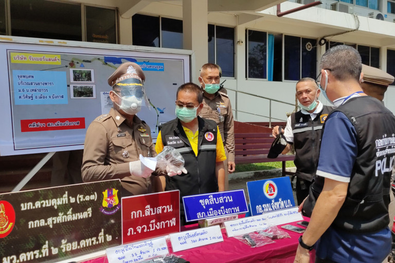 จากกรณีคนร้าย 5 คนบุกเข้าไปในสวนยางพาราเพื่อทวงถามหนี้ค่ายาบ้า โดยให้ 2 คนยืนดูเฝ้าต้นทาง ส่วน 3คนเข้าไปเรียกเจ้าของสวนยางกับเพื่อนรวม 3 คนที่มาช่วยเปิดกรีดยางวันแรกลงมาคุยตกลงเรื่องเงินที่ยังค้างจ่ายกว่าแสนบาท แต่คุยตกลงกันไม่ได้ฝ่ายคนร้ายที่มีนายธราเทพหรือแบงค์ ลำยาว อายุ 18 ปี เป็นหัวโจกชักปืนออกมายิงนายอุดมหรือเตื่อย โพธิ์ศรี อายุ 29 ปี นายศักดาหรืออ้น เขาภูเขียว อายุ 33 ปี เสียชีวิต และนายชุติพงษ์หรือทัศน์ เสาะสมบูรณ์ อายุ 29 ปีที่ยืนอยู่ใกล้วิ่งหนีจึงถูกยิงได้รับบาดเจ็บสาหัสเกิดเหตุคืนวันที่ 28 เม.ย.สายๆ วันที่ 29 เม.ย.มีผู้มาพบศพและนำผู้บาดเจ็บส่ง รพ.บึงกาฬ ตำรวจชุดสืบสวน สภ.เมืองบึงกาฬ สืบสวน ภ.จว.บึงกาฬและชุดสืบภาค 4 สามารถจับกุมเยาวชนอายุ 15-17 ปีได้ 3 คน สอบสวนซัดทอดนายธราเทพหรือแบงค์ ลำยาวเป็นคนลงมือยิง หลังก่อนเหตุได้หนีไปพร้อมดับนายรัชชานนท์หรือนนท์ใหญ่ พรมกุดตุ้ม อายุ 18 ปี ถูกเจ้าหน้าที่กดดันหนักจึงเข้ามอบตัว ถูกตั้งข้อหาหนัก 6 กระทง นำมาแถลงข่าวเช้านี้