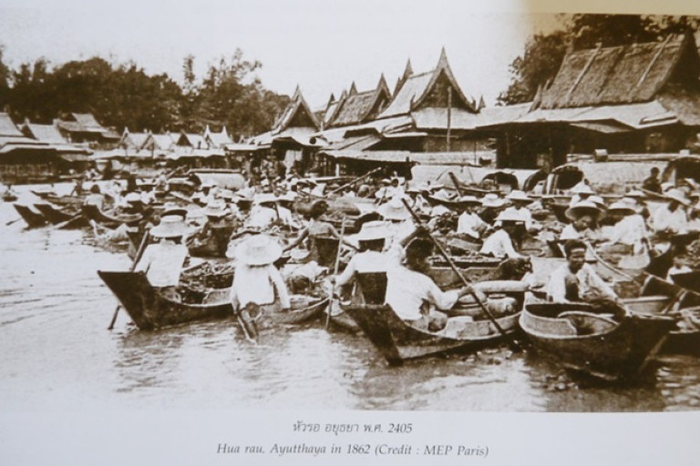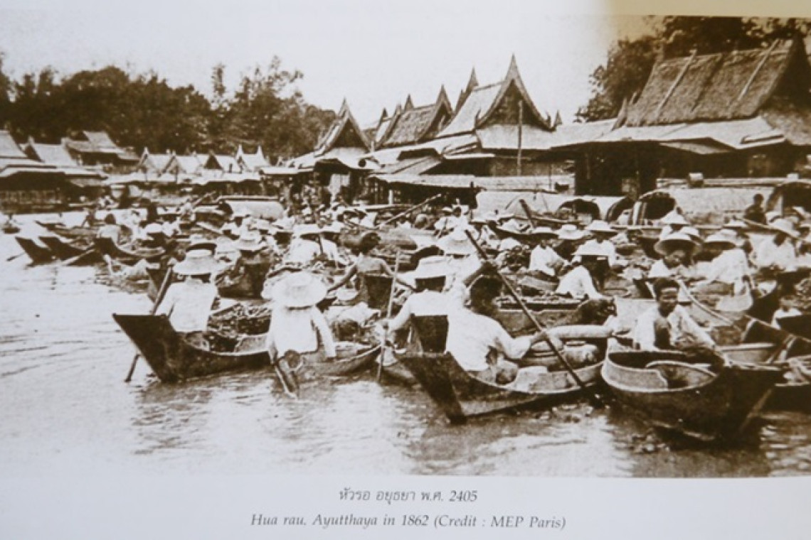 ปกิณกภาพ หัวรอ อยุธยา พ.ศ.2405 จัดเป็นภาพเก่า บันทึกวิถีชีวิตชาวอยุธยาค้าขายทางเรือ บ้านเรือนแพตั้งอยู่ริมแม่น้ำของเกาะเมืองอยุธยา เมื่อ 155 ปีที่แล้ว (พ.ศ. 2405 – 2560) ในภาพ มีเพียงบรรยาย “หัวรอ อยุธยา พ.ศ. 2405 Hua rau. Ayutthaya in 1862 (Credit : MEP Paris) เข้าใจว่าภาพ “หัวรอ” นี้เป็นตลาด ปัจจุบันชื่อนี้ยังคงมีอยู่เรียกกัน ตลาดหัวรอ ตั้งอยู่ริมแม่น้ำของเกาะเมืองอยุธยา คำว่า “หัวรอ” เท่าที่สืบค้นข้อมูล คือ ทำนบที่สร้างขึ้นสำหรับเบี่ยงเบนกระแสน้ำในแม่น้ำ จึงเรียกอีกอย่างหนึ่งว่า “ทำนบรอ” ในสมัยกรุงศรีอยุธยา มีทำนบรออยู่ทางด้านตะวันออกเฉียงเหนือของเกาะเมือง ซึ่งมีลำน้ำสายใหญ่อย่างน้อยๆ 2 สาย ไหลมาบรรจบกัน คือ แม่น้ำลพบุรี กับแม่น้ำป่าสัก สายหนึ่งไหลวกไปเป็นคลองเมืองทางด้านเหนือ ส่วนอีกสาย ไหลตรงลงมาเมืองคลองเมืองด้านตะวันออก อย่างไรก็ตาม กระแสน้ำมักไหลมาทางตะวันออกมากกว่าทางเหนือ ดังนั้น ทางการจึงต้องสร้างทำนบเพื่อชะลอกระแสน้ำให้ไหลไปทั้ง 2 ทางพร้อมๆ กัน ทำนบดังกล่าว นอกจากจะมีประโยชน์ในเรื่องกระแสน้ำแล้ว ยังสามารถใช้เป็นสะพานข้ามแม่น้ำอีกด้วย เพราะฉะนั้นบริเวณดังกล่าวจึงกลายเป็น “ตลาด” ขนาดใหญ่ ที่มีการซื้อขายแลกเปลี่ยนสินค้ากันอย่างคึกคัก เพราะเป็นจุดที่เกวียนบรรทุกสินค้าต่างเมืองสามารถข้ามฝั่งเข้ามายังเกาะเมืองพระนครศรีอยุธยาได้ (องค์ความรู้ฉบับย่อ : ตลาดหัวรอ..ตลาดโบราณ 200 กว่าปี , ภาพหนังสือ “พระบาทสมเด็จพระจุลจอมเกล้าเจ้าอยู่หัว พระบิดาแห่งการถ่ายภาพไทย” ศูนย์หนังสือจุฬาฯ พิมพ์ ต.ค.2555)