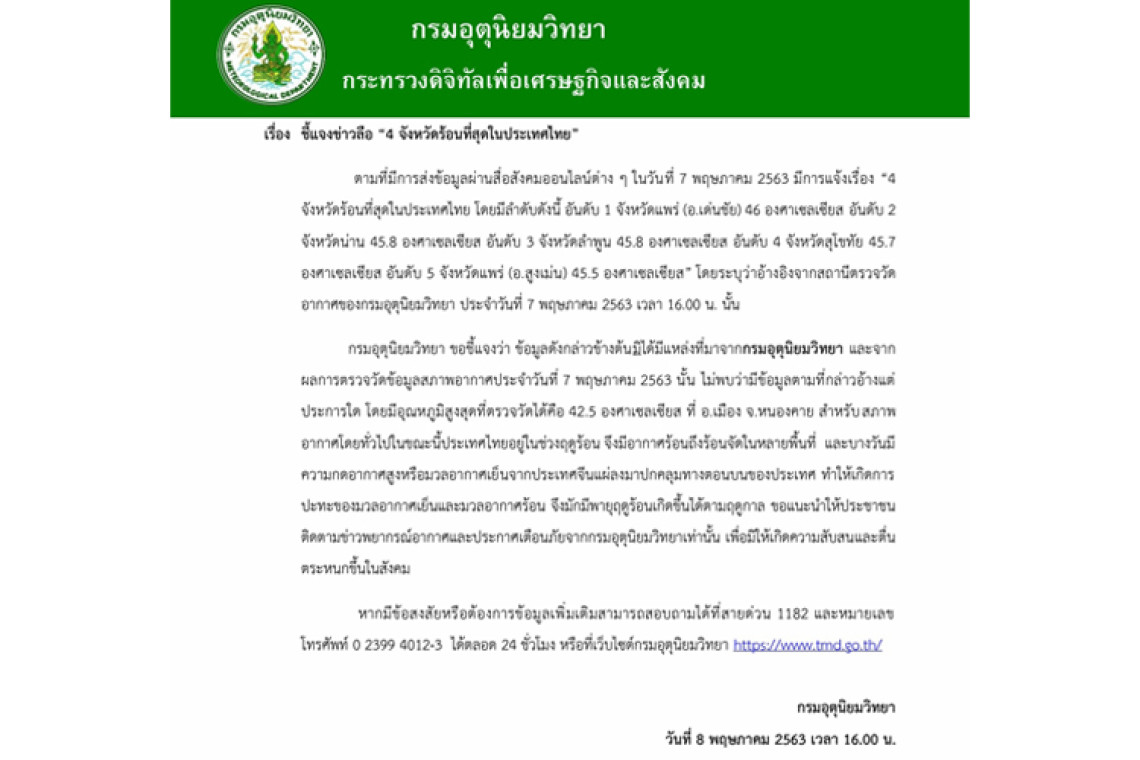 กรมอุตุนิยมวิทยาประชาสัมพันธ์ แจ้งว่า ตามที่มีการส่งข้อมูลผ่านสื่อสังคมออนไลน์ต่าง ๆ ในวันที่ 7 พฤษภาคม 2563 มีการแจ้งเรื่อง “4 จังหวัดร้อนที่สุดในประเทศไทย โดยมีลำดับ ดังนี้ อันดับ 1 จังหวัดแพร่ (อ.เด่นชัย) 46 องศาเซลเซียส อันดับ 2 จังหวัดน่าน 45.8 องศาเซลเซียส อันดับ 3 จังหวัดลำพูน 45.8 องศาเซลเซียส อันดับ 4 จังหวัดสุโขทัย 45.7 องศาเซลเซียส อันดับ 5 จังหวัดแพร่ (อ.สูงเม่น) 45.5 องศาเซลเซียส” โดยระบุว่าอ้างอิงจากสถานีตรวจวัดอากาศของกรมอุตุนิยมวิทยา ประจำวันที่ 7 พฤษภาคม 2563 เวลา 16.00 น.