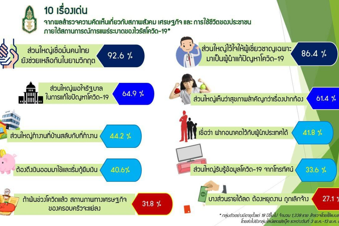 วันที่ 15 พ.ค.63 สำนักวิจัยและพัฒนา สถาบันพระปกเกล้า เปิดเผยโพลล์การสำรวจความคิดเห็นในหัวข้อเกี่ยวกับสภาพสังคม เศรษฐกิจและการใช้ชีวิตของประชาชนภายใต้สถานการณ์การแพร่ระบาดของไวรัสโควิด-19 ผ่านช่องทางการสื่อสารออนไลน์ โดยเก็บผลการสารวจ ระหว่างวันที่ 3 ถึง 13 พ.ค.63 สรุปจานวนผู้ตอบทั้งสิ้น 1,338 คน จาแนกเป็นเพศชาย ร้อยละ 41.9 เพศหญิง ร้อยละ 57.1 ที่เหลือเป็นกลุ่มเพศทางเลือก เมื่อจาแนกตามอายุ พบว่าเป็นกลุ่มผู้มีอายุ 46-60 ปี ร้อยละ 44.5 อายุ 26-45 ปี ร้อยละ 37.8 อายุ 60 ปีขึ้นไป ร้อยละ 13.6 และกลุ่มอายุ 18-25 ปี ร้อยละ 4.1 ผลการสำรวจพบว่า