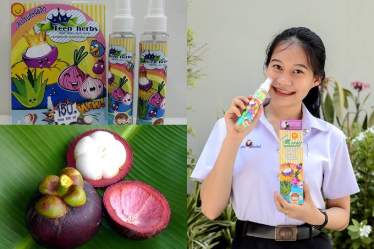 และจากการศึกษาพบว่า มังคุดเป็นผลไม้ท้องถิ่นภาคตะวันออกที่ถือได้ว่าเป็นสมุนไพรธรรมชาติที่มีสรรพคุณทางยาในการรักษาโรคต่าง ๆ โดยเฉพาะเปลือกมังคุดซึ่งมีสารแซนโทน ช่วยให้แผลหายเร็ว ลดอาการอักเสบ และรักษาอาการติดเชื้อบริเวณผิวหนัง ตลอดจนมีฤทธิ์ต้านเชื้อแบคทีเรียที่ทำให้เกิดหนองได้ จึงได้นำเปลือกมังคุดมาทดลองคิดค้นจนได้เป็นสูตรสเปรย์แก้สิวที่ผ่านกระบวนการทางเทคโนโลยีชีวภาพ โดยการสกัดสารแซนโทนจากเปลือกมังคุดด้วยเอทานอลความเข้มข้น12.5 mg./ml.ที่มีฤทธิ์ในการยับยั้งเชื้อแบคทีเรีย Staphylococcus aureus ที่เป็นสาเหตุในการเกิดสิว และมีส่วนผสมของว่านหางจระเข้ที่ช่วยลดการอักเสบของสิว และสารสกัดจากหอมแดงที่ช่วยลดรอยแดงของสิว