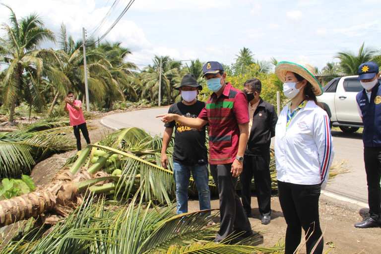 นางดวงสมร พฤฑฒิกุล เกษตรจังหวัด เปิดเผยว่า ต้องสำรวจพื้นที่เสียหายอย่างสิ้นเชิง ทางราชการโดยกระทรวงการคลังจะมีมาตรการระเบียบในการช่วยเหลือคิดเป็นอัตราเป็นไร่ ถ้าเป็นไม้ผล คิดไร่ละ 1,690 กรณีอย่างมะพร้าวน้ำหอมจะคิดเป็นไม้ผล แต่กรณีเสียหายเป็นหย่อมๆไม่หมดทั้งไร่ ให้นับรวมกัน 40 ต้น คิดเป็น 1 ไร่ เกษตรกรจะต้องไปแจ้งขอรับการช่วยเหลือที่ท้องถิ่น เพื่อดำเนินการตามขั้นตอนการช่วยเหลือ เบื้องต้นทางท้องถิ่นมีอำนาจการช่วยเหลือก่อน ถ้าวงเงินที่เสียหายในท้องที่มากเกินกว่าที่ท้องถิ่นจะช่วยเหลือได้ก็จะมีเงินทดรองราชการสำหรับตั้งไว้ และขอรับการช่วยเหลือตามลำดับขึ้นมา จากการตรวจสอบสวนเกษตรกรเบื้องต้นประมาณ 6 ราย ส่วนที่เป็นแปลงใหญ่ๆจะมี 1 ราย สภาพต้นมะพร้าวล้มถอนรากถอนโคนเป็นแปลง ส่วนแปลงอื่น ๆได้รับความเสียหายเป็นหย่อมๆ นับแล้ว 1 รายเสียหายประมาณ 1-2 ไร่ รวมพื้นที่เสียหายแล้วประมาณ 10 ไร่ ซึ่งทางเจ้าหน้าที่จะเร่งสำรวจพื้นที่อย่างละเอียดเพื่อเร่งให้ความช่วยเหลือชาวบ้านและเกษตรกรที่ได้รับผลกระทบโดยเร็ว