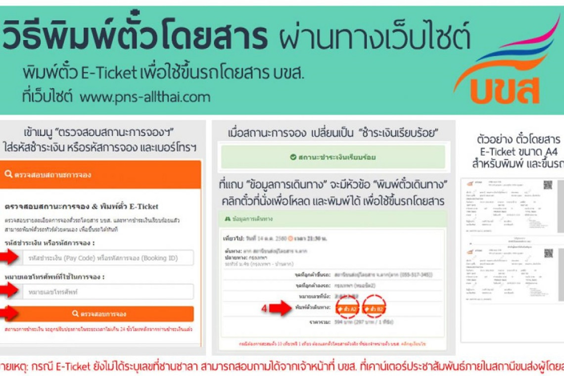 ผู้โดยสารสามารถจองตั๋วรถ บขส. ล่วงหน้า ผ่านทางออน์ไลน์ได้ ที่ เว็บไซต์ บขส. transport.co.th , เคาน์เตอร์เซอร์วิส 7-Eleven , www.pns-allthai.com , www.busticket.in.th , ไทยทิคเก็ตเมเจอร์ , https://12go.asia/th หรือ สอบถามข้อมูลเพิ่มเติมได้ที่ Call Center 1490 เรียก บขส. ตลอด 24 ชั่วโมง , ติดตามข้อมูลข่าวสารได้ที่เว็บไซต์ transport.co.th, Facebook Fanpage : บขส. และ Line@บขส.