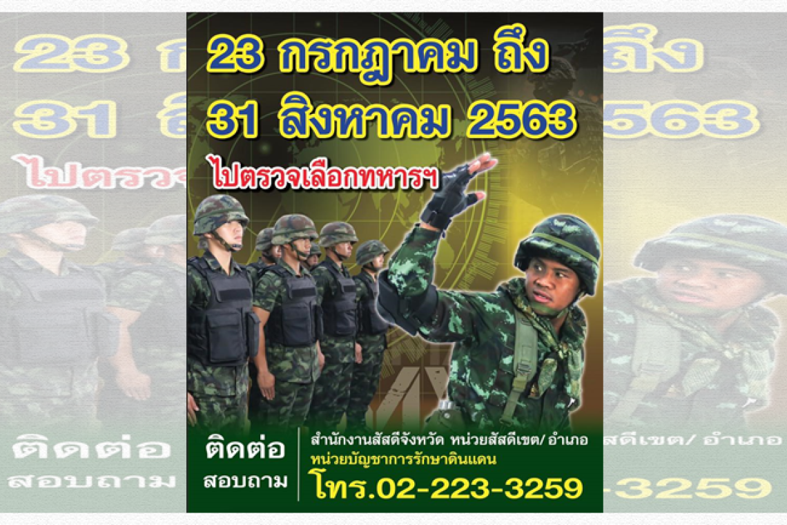 วันที่ 20 พ.ค. 2563 “กองการสัสดี” ประกาศกำหนดวันดำเนินการตรวจเลือกทหาร ประจำปี 2563 แล้ว ในระหว่างวันที่ 23 ก.ค.–31 ส.ค.2563 ดังนี้