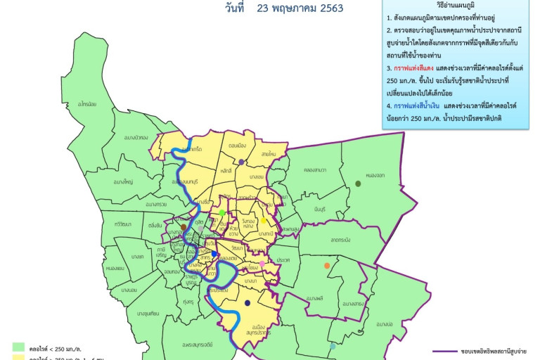 การประปานครหลวง (กปน.) รายงานภาพรวมน้ำประปาในพื้นที่กรุงเทพมหานคร นนทบุรี และสมุทรปราการ วันที่ 23 พ.ค.63 พบว่าค่าคลอไรด์ส่วนใหญ่ได้มาตรฐาน สามารถใช้ในการอุปโภคได้ตามปกติ แต่ควรหลีกเลี่ยงการบริโภคบางช่วงเวลา โดยค่าคลอไรด์ เกินกว่า 250 มิลลิกรัมต่อลิตร ส่งผลต่อการรับรู้รสชาติเป็นบางช่วงเวลา (ช่วงกราฟสีแดง) เป็นเวลา 1 ชั่วโมง แนะนำกลุ่มเสี่ยง (เด็กเล็ก ผู้สูงอายุ ผู้ป่วย) ควรหลีกเลี่ยงการบริโภค ส่วนช่วงเวลาอื่น น้ำประปามีรสชาติปกติ ควรสำรองน้ำไว้ (ช่วงกราฟสีน้ำเงิน) ทั้งนี้ ประชาชนควรตรวจสอบคุณภาพน้ำประปาในพื้นที่ของตนเอง