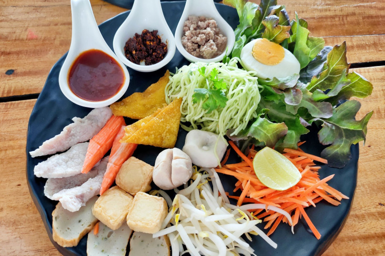 "สำหรับวัตถุดิบหมี่คลุก จะประกอบด้วย เส้นหมี่ เครื่องเคียง ปูอัด ปลาแผ่น ลูกชิ้นหมู และผักออแกนิค ซึ่งทางร้านจะเน้นใช้วัตถุดิบเกรดเอ ที่มีอยู่ในจังหวัด และทำสดใหม่วันต่อวัน เช่น หมูรวน พริกน้ำมัน โดยเฉพาะน้ำซอส ที่เริ่มศึกษามาจากยูทูป ก่อนพัฒนาเป็นสูตรจนเป็นที่ยอมรับของลูกค้า ทำให้คิดได้ว่าในช่วงวิกฤตก็ยังมีโอกาส เพราะทำให้ทางร้านได้คิดเมนูใหม่ และทำน้ำซอสสูตรของตัวเอง เป็นเมนูหมี่คลุกเจ้าแรกในจังหวัดตรัง ที่สามารถขายน้ำซอสให้สำหรับผู้ที่สนใจนำไปทานกับเมนูอื่นๆ ได้ด้วย เพราะเก็บไว้ในตู้เย็นได้นานประมาณ 2 สัปดาห์"นางพรชนก กล่าว
