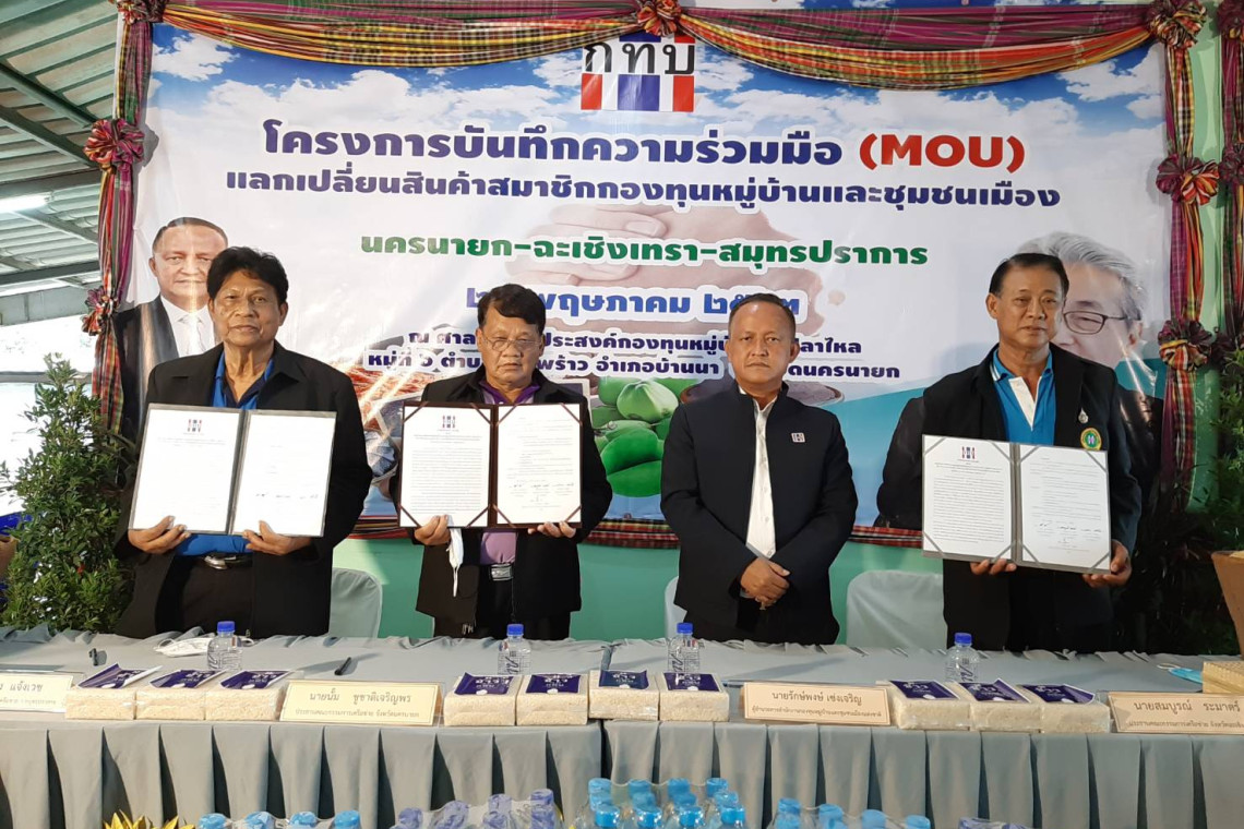 นอกจากการทำ MOU แล้ว ทั้ง 3 จังหวัดได้มีการนำผลิตผลทางการเกษตรมาซื้อขายแลกเปลี่ยนกัน อาทิ ข้าวสารจากนครนายก ไข่ไก่จากฉะเชิงเทรา และปลาสลิดจากสมุทรปราการ เป็นมูลค่ากว่า 2.5 แสนบาท และการจัดบูธของสมาชิกกองทุนหมู่บ้านกว่า 20 กองทุน เพื่อแสดงผลผลิตทางการเกษตรและแนะนำสินค้าในชุมชนเพื่อเป็นช่องทางในการซื้อขายสินค้า สามารถสร้างกลไกเชื่อมโยงขยายไปยังภูมิภาคและทั่วประทศอย่างต่อเนื่องจะส่งผลให้เกิดการขับเคลื่อนเศรษฐกิจฐานรากต่อไป