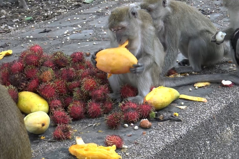 ในขณะเดียวกัน มีสาวน้อยใจบุญ 2 คน ซื้อผลไม้ มีทั้งมะม่วง เงาะและแก้วมังกร ใส่ถุงขนาดใหญ่นำมาวางให้ลิงกิน เหมือนปาร์ตี้ผลไม้ย่อมๆ เนื่องจาก ที่ผ่านมาก็เคยนำผลไม้มาให้ลิงกินเป็นประจำ วันนี้ตั้งใจมาโดยซื้อมะม่วงเงาะและแก้วมังกร มาให้ลิงกินอีกครั้งหนึ่ง เนื่องจากเห็นว่า ช่วงนี้มะม่วงออกมาเยอะ ราคาไม่แพง รวมทั้งเป็นการอุดหนุนพ่อค้าแม่ค้าด้วย ลิงจะได้กินมะม่วง เงาะและแก้วมังกร แทนกล้วย ซึ่งที่ปกติลิงก็ได้กินกล้วยจากนักท่องเที่ยวทุกวันอยู่แล้ว เมื่อมีผลไม้โปรดของลิงมาวาง ก็คือ มะม่วงสีเหลือง ฝูงลิงจะกรูเข้ามาหยิบมะม่วงกินทั้งมะม่วง ทั้งเงาะ สวนแก้วมังกรตั้งไว้ก่อน เนื่องจากมะม่วงเงาะกินง่ายกว่า โดยลิงจะปลอกเปลือกมะม่วงออกเหมือนคน กัดกินเนื้อมะม่วงส่วนเปลือกทิ้ง ลิงตัวเล็กและลิงตัวใหญ่ ปาร์ตี้ผลไม้กันอย่างสนุกสนานและอิ่มหนำสำราญไปทั่วหน้าทุกตัว