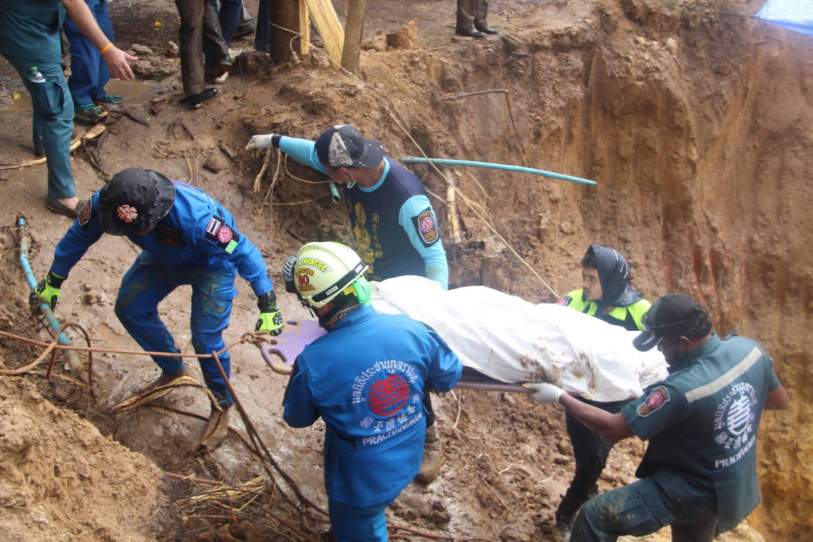 เมื่อช่วงเวลา 15.00 น. ( 11 มิ.ย. 63) เจ้าหน้าที่มูลนิธิประชานุกูลราชบุรี ได้นำร่างของนางสุกัญญาขึ้นมาจากก้นบ่อได้สำเร็จ ท่ามกลางสายฝนที่ตกลงมาอย่างหนัก ทำให้การนำศพขึ้นมานั้นยากลำบากมาก จากการสอบถามนายประกิจ เพ่งไพฑูรย์ อายุ 53 ปี รองหัวหน้าหน่วยกู้ภัยประชานุกูลราชบุรี กล่าวว่า จากที่ลงไปนำศพขึ้นมาพบว่ามีบาดแผลอยู่บริเวณด้านซ้ายที่กะโหลก มีร่องรอยยุบลงไป เสื้อผ้ายังอยู่ครบมีเสื้อกล้าม กางเกงขายาวสีเทาควันบุหรี่มีเศษปูนที่เป็นลองทับอยู่ มีดินเป็นก้อนๆและมีแผ่นกระเบื้องแผ่นเรียบทับอยู่ ซึ่งการนำศพขึ้นมาต้องขุดดินขึ้นมาก่อนแล้วถึงจะนำร่างขึ้นมาได้ แต่ทำงานลำบากมากเพราะมีฝนตกลงมาขึ้นมาก่อน มีความลึกประมาณ 1 เมตรจากที่มีการนำรถแบ๊กโฮขุดโกยตักมาแล้ว และต้องโกยดินขึ้นมาก่อนจึงจะเจอร่าง