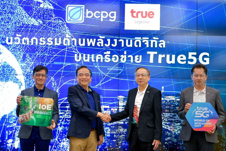 บีซีพีจี ผู้นำธุรกิจผลิตไฟฟ้าจากพลังงานหมุนเวียนระดับแนวหน้าในภูมิภาคเอเชียแปซิฟิก โดยนายบัณฑิต สะเพียรชัย กรรมการผู้จัดการใหญ่ บมจ.บีซีพีจี ประกาศความร่วมมือกับกลุ่มทรู ผู้นำโครงสร้างพื้นฐานโทรคมนาคมดิจิทัล โดยนายอาณัติ เมฆไพบูลย์วัฒนา กรรมการผู้จัดการใหญ่ (ร่วม) บมจ.ทรู คอร์ปอเรชั่น ร่วมด้วยนายอภิชัย ฤทธิบุตร ผู้อำนวยการ Center of Digital Energy (CODE) ผู้พัฒนา Internet of Energy Solution บมจ.บีซีพีจี และนายพิรุณ ไพรีพ่ายฤทธิ์ หัวหน้าคณะทำงานและกรรมการยุทธศาสตร์ 5G บมจ.ทรู คอร์ปอเรชั่น สร้างสรรค์ True 5G Intelligent EnergyTech นวัตกรรมต้นแบบ 5G ด้านพลังงาน พลิกโฉมบริการด้านพลังงานรูปแบบใหม่ที่ขับเคลื่อนด้วยระบบดิจิทัลอย่างเต็มรูปแบบ เชื่อมโยงผ่านอัจฉริยภาพของเครือข่าย True 5G