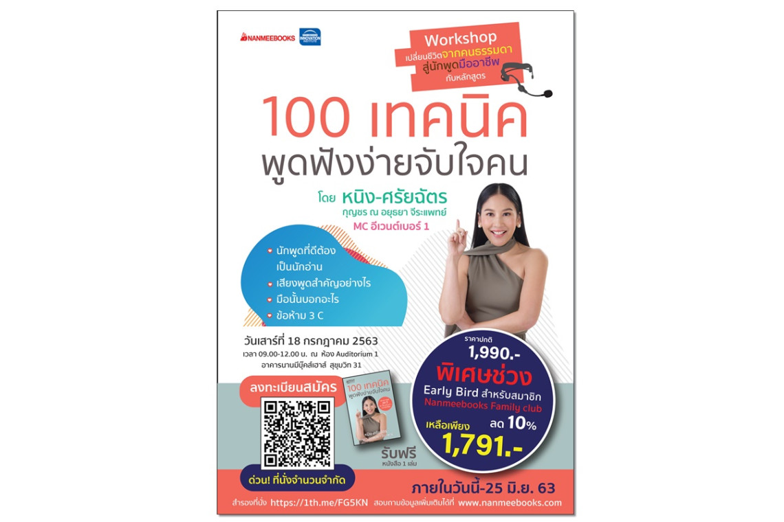 เมื่อต้องพูดต่อหน้าคนอื่น คุณเคยมีอาการตื่นเต้น มือสั่น จิตตก ลืมสิ่งที่ตังใจจะพูดไหม เวลาต้องพูดในที่ประชุมก็มักมีบางอย่างผิดพลาด หรือนำเสนองานไม่น่าสนใจ ถ้าคุณกำลังรู้สึกว่าตัวเองมีปัญหาในการพูด ให้ 100 เทคนิค พูดฟังง่ายจับใจคน ช่วยเปลี่ยนคุณเป็นคนใหม่ ที่พูดได้โดยไม่ต้องกลัวอีกต่อไปกับ Workshop เปลี่ยนชีวิตคนธรรมดาสู่นักพูดมืออาชีพ กับหลักสูตร"100 เทคนิคพูดฟังง่ายจับใจคน"โดย หนิง-ศรัยฉัตร พิธีกรอีเวนต์ เบอร์1 ของเมืองไทย เจ้าของฉายาเจ้าแม่อีเวนต์ และพิธีกรตัวท็อป วันเสาร์ ที่ 18 ก.ค.63 เวลา 09:00-12:00 น.ณ อาคารนานมีบุ๊คส์เฮ้าส์ สุขุมวิท 31