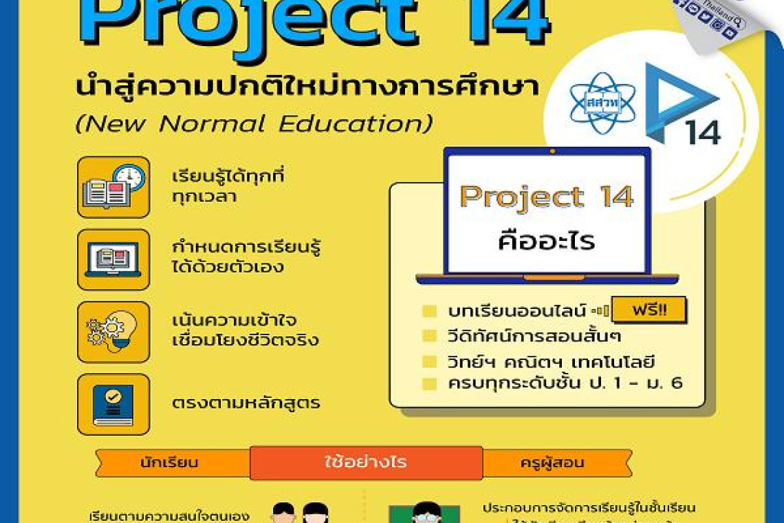 ศ.ดร.ชูกิจ ลิมปิจำนงค์ ผอ.สถาบันส่งเสริมการสอนวิทยาศาสตร์และเทคโนโลยี (สสวท.) เปิดเผยว่า เพื่อรับมือกับการเปลี่ยนเข้าสู่วิถีชีวิตยุคนิวนอร์มัล (New Normal) การเรียนการสอนวิทยาศาสตร์ จึงต้องปรับตัวให้ทันเพื่อพัฒนาผู้เรียนได้อย่างสอดคล้องกับการใช้ชีวิตที่เปลี่ยนไปและการเปิดรับสื่อจากหลากหลายช่องทาง สสวท. จึงได้จัดทำProject 14ซึ่งเป็นโครงการสอนออนไลน์นำสู่ความปกติใหม่ทางการศึกษาของ สสวท. (New Normal Education) ที่การเรียนรู้ไม่ได้จำกัดเพียงแค่ในห้องเรียน แต่สามารถเกิดได้ทุกที่ทุกเวลาตามที่ผู้เรียนเลือกหรือกำหนด