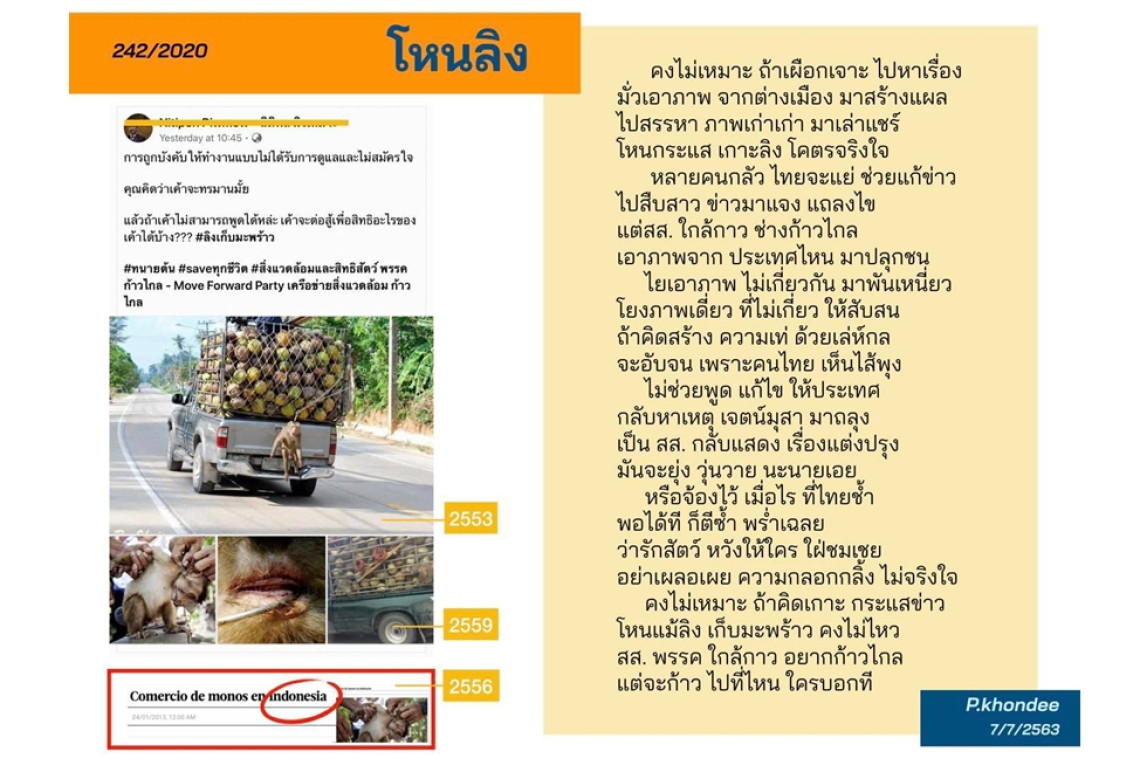 เพจเฟซบุ๊ก P.khondee (พี่คนดี กวีสมัครเล่น) โพสต์ข้อความระบุว่า ส.ส. บัญชีรายชื่อ พรรค ใกล้กาว  ท่านหนึ่ง เอารูป ลิงเก็บมะพร้าว สามสี่รูปที่ไม่เกี่ยวกันเลยมายำรวมกัน บางรูปเอามาจากประเทศ อินโดนีเซีย บางรูปเป็นรูปเก่าหลายปีแล้ว แล้วมาสร้างกระแส ให้ตนเอง ในการเรียกร้อง สิทธิสัตว์ แล้วก็บ่นเกี่ยวกับ 'การถูกบังคับให้ทำงานแบบไม่สมัครใจ และไม่ได้รับการดูแล ความทรมาน ความไม่สามารถต่อสู้เพื่อสิทธิ'