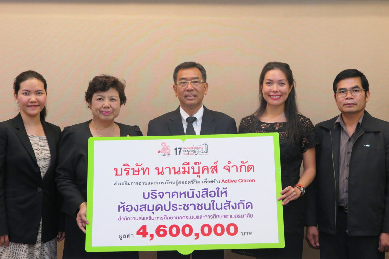 นายกฤตชัย อรุณรัตน์ (กลาง) เลขาธิการ กศน. ร่วมรับมอบหนังสือจาก นางสาว คิม จงสถิตย์วัฒนา (ที่ 2 จากขวา) กรรมการผู้จัดการ บริษัท นานมีบุ๊คส์ จำกัด ในโอกาสครบรอบ 25 ปี นานมีบุ๊คส์ ร่วมบริจาคหนังสือรวมมูลค่า 4,600,000 บาท ให้ห้องสมุดประชาชนในสังกัดสำนักงานส่งเสริมการศึกษานอกระบบและการศึกษาตามอัธยาศัย (กศน.) รวม 914 แห่ง เพื่อร่วมส่งเสริมการอ่านและการเรียนรู้ตลอดชีวิตเพื่อสร้าง Active Citizen โดยมี นางวัชรีภรณ์ โกสินเจริญชัย (ที่ 2 จากซ้าย) ฝ่ายงานบริหารทั่วไปงานแผนและยุทธศาสตร์ สถาบันส่งเสริมและพัฒนนวัตกรรมการเรียนรู้, นางสาวศิริกุล จารุจันทร์ (ซ้าย) ผู้อำนวยการฝ่ายขายและการตลาด และนายสมศักดิ์ กาละพัฒน์ (ขวา) ผู้อำนวยการด้านนวัตกรรมการเรียนรู้ บริษัท นานมีบุ๊คส์ จำกัด ณ กระทรวงศึกษาธิการ