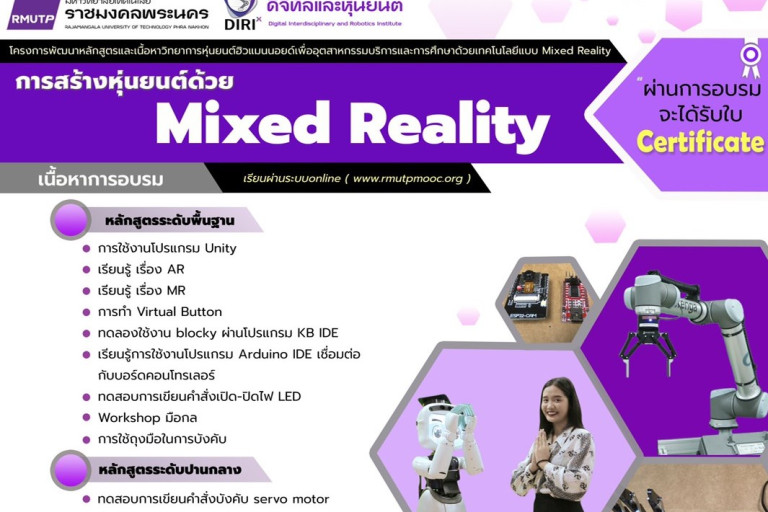 สถาบันสหวิทยาการดิจิทัลและหุ่นยนต์ มหาวิทยาลัยเทคโนโลยีราชมงคลพระนคร เชิญชวนนักศึกษา บุคลากรของรัฐ และภาคเอกชนที่สนใจ เข้าร่วมอบรม “โครงการพัฒนาหลักสูตรและวิทยาการหุ่นยนต์ฮิวแมนนอยด์ เพื่ออุตสาหกรรมบริการด้วยเทคโนโลยี Mixed Reality” เพื่อเผยแพร่ความรู้ในการพัฒนาหุ่นยนต์บริการ สำหรับพัฒนาศักยภาพการศึกษาและการสร้างอาชีพใหม่ในยุคอุตสาหกรรม 4.0 ด้วยเทคโนโลยี Mixed reality โดยการอบรมแบ่งเป็น 3 หลักสูตร ได้แก่ 1.ระดับพื้นฐาน อบรมระหว่างวันที่ 13-30 สิงหาคม 2563 เนื้อหาการอบรมประกอบด้วย การใช้โปรแกรม Unity การเรียนรู้การทำ AR MR Virtual Button และการใช้โปรแกรม Arduino IDE สำหรับเชื่อมต่อบอร์ดคอนโทรเลอร์ 2.ระดับกลาง อบรมระหว่างวันที่ 15-21 สิงหาคม 2563 เนื้อหาการอบรมประกอบด้วย การเขียนคำสั่งบังคับ Servo Motor ผ่านแอปพลิเคชัน Blynk และระดับสูง อบรมระหว่างวันที่ 22-23 สิงหาคม 2563 เนื้อหาการอบรมประกอบด้วย การใช้ Unity ควบคุมบอร์ดคอนโทรเลอร์ ผ่าน AR เป็นต้น ณ สำนักบริการคอมพิวเตอร์ ห้องปฏิบัติการคอมพิวเตอร์ 406 มหาวิทยาลัยเกษตรศาสตร์ (บางเขน) กรุงเทพฯ ทั้งนี้ได้รับเกียรติจาก นาวาตรี ดร.วุฒิพงศ์ พงศ์สุวรรณ ผู้เชี่ยวชาญด้าน Digital Technology AR , VR และระบบ ROS เป็นวิทยากรให้ความรู้ ผู้สนใจสมัครเข้าร่วมอบรมสอบถามข้อมูลเพิ่มเติม โทรศัพท์ 090 981 4177 หรือ LINE ID : @diri.rmutp และ aued2627