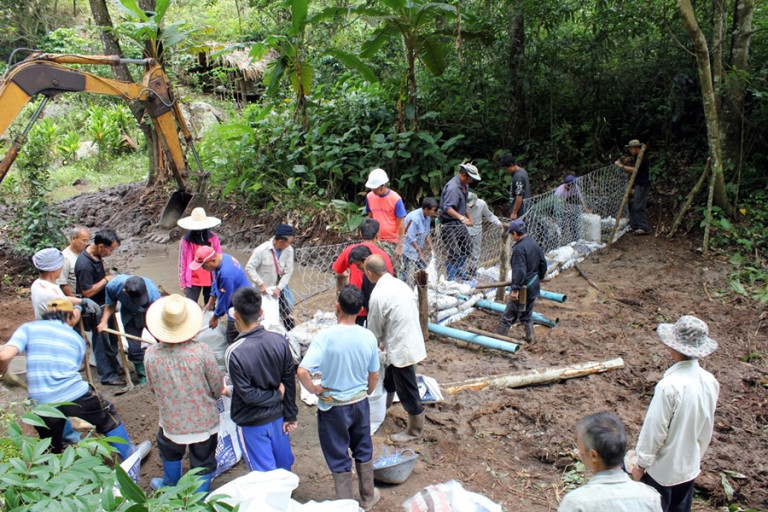 สหกรณ์จังหวัดเชียงราย กล่าวอีกว่า จังหวัดเชียงราย ได้ดำเนินการสำรวจสหกรณ์ กลุ่มเกษตรกรในพื้นที่ เพื่อคัดเลือกเป้าหมายให้การดำเนินกิจกรรมสร้างฝายชะลอน้ำ โดยมอบหมายให้นายสิน สุทธนู ผู้อำนวยการกลุ่มจัดตั้งและส่งเสริมสหกรณ์ บุคลากรสำนักงานสหกรณ์จังหวัดเชียงราย เข้าร่วมกับชาวชุมชนบ้านห้วยคุณพระ ซึ่งได้รับความร่วมมือ จำนวน 54คน พร้อมด้วยเครื่องจักร รถแบคโฮ ร่วมสร้างฝายชะลอน้ำประเภทกึ่งถาวร (ฝายลวดตาข่ายบรรจุด้วยกระสอบดินผสมปูน) จำนวน 1 ฝาย โดยขบวนการสหกรณ์ร่วมสมทบทุน จำนวน 9,630 บาท ในพื้นที่บ้านห้วยคุณพระ หมู่ที่ 12 ตำบลแม่เจดีย์ อำเภอเวียงป่าเป้า จังหวัดเชียงราย