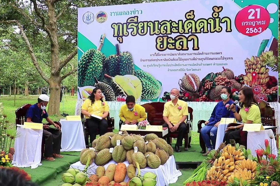 เมื่อวันที่ 21 กรกฎาคม 2563 ณ ศูนย์เรียนรู้การเพิ่มประสิทธิภาพการผลิตสินค้าเกษตร ต.สะเอะ อ.กรงปินัง จ.ยะลา นายชัยสิทธิ์ พานิชพงศ์ ผู้ว่าราชการจังหวัดยะลา นายจำนงค์ เพชรอนันต์ เกษตรจังหวัดยะลา พร้อมด้วย ส่วนราชการที่เกี่ยวข้อง และเครือข่ายเกษตรกรชาวสวนทุเรียน พร้อมด้วยผู้ประกอบการในพื้นที่จังหวัดยะลา ได้ร่วมกันจัดงานแถลงข่าว ทุเรียนสะเด็ดน้ำยะลา โดยภายในงานแถลงข่าว ได้มีการนำเอาผลผลิตจากทุเรียน ทั้งทุเรียนสด และทุเรียนแปรรูปมาจัดแสดงให้ผู้เข้าร่วมงานได้ชิมรสชาติของทุเรียน ที่ปลูกในพื้นที่ยะลา ไม่ว่าจะเป็นทุเรียนสด ไอติมทุเรียน ซาเปาทุเรียน ทุเรียนเชื่อม ขนมหม้อแกงทุเรียน และแกงส้มทุเรียน นอกจากนี้ก็ยังมีการเสวนาเรื่องสถานการณ์ทุเรียนในจังหวัดยะลา นายชัยสิทธิ์ พานิชพงศ์ ผู้ว่าราชการจังหวัดยะลา กล่าวว่า จังหวัดยะลา เป็นแหล่งปลูกทุเรียนและมีปริมาณผลผลิตมากที่สุดในพื้นที่ภาคใต้ตอนล่าง และเป็นแหล่งปลูกทุเรียนพันธุ์หมอนทองที่มีคุณภาพ ปี 2563 มีเนื้อที่ปลูกทุเรียน 73,890 ไร่ พื้นที่ให้ผลผลิตแล้ว 53,621 ไร่ ครัวเรือนผู้ปลูก 25,326 ครัวเรือน ผลผลิตรวม 53,031 ตัน สร้างรายได้รวม 2,000 ล้านบาท โดยเนื้อที่ปลูกกระจายทั่วทุกพื้นที่ โดยทุเรียนของจังหวัดยะลา เป็นทุเรียนคุณภาพ ปลอดภัยจากสารเคมี มีลักษณะพิเศษ คือ เนื้อแห้ง เหนียวนุ่ม รสชาติหอม หวาน ที่มีฉายาว่า ทุเรียนสะเด็ดน้ำยะลา ซึ่งสร้างรายได้แก่ชาวสวนทุเรียนยะลา ประมาณ 2,000 ล้านบาทต่อปี ด้านนายจำนงค์ เพชรอนันต์ เกษตรจังหวัดยะลา กล่าวว่า ในด้านการส่งเสริมและพัฒนาการผลิตทุเรียน มีการขับเคลื่อน “ยะลาเมืองทุเรียน” โดยมีโครงการระบบส่งเสริมเกษตรแบบแปลงใหญ่ โดยการส่งเสริมในรูปแบบแปลงใหญ่ เป็นการรวมกลุ่มเกษตรกรรายย่อยผู้ปลูกทุเรียน ให้มีการบริหารจัดการร่วมกัน เพื่อให้เกิดการรวมกันผลิตและรวมกันจำหน่าย โดยจังหวัดยะลาได้รวมกลุ่มเป็นแปลงใหญ่มากที่สุดในประเทศรวม 21 แปลง และมีช่องทางการซื้อขายผลผลิตทุเรียน หลักๆ ได้ 3 ช่องทาง คือการกระจายทุเรียนภายในประเทศ จำนวน 18,942 ตัน ส่งออกไปยังต่างประเทศทั้งในรูปแบบผลสด แปรรูปเป็นทุเรียนแช่แข็ง จำนวน 25,350 ตัน และการแปรรูป จำนวน 8,739 ตัน โดยการแปรรูปของกลุ่มเกษตรกร และโรงงานแปรรูป อำเภอเบตง และอำเภอบันนังสตา