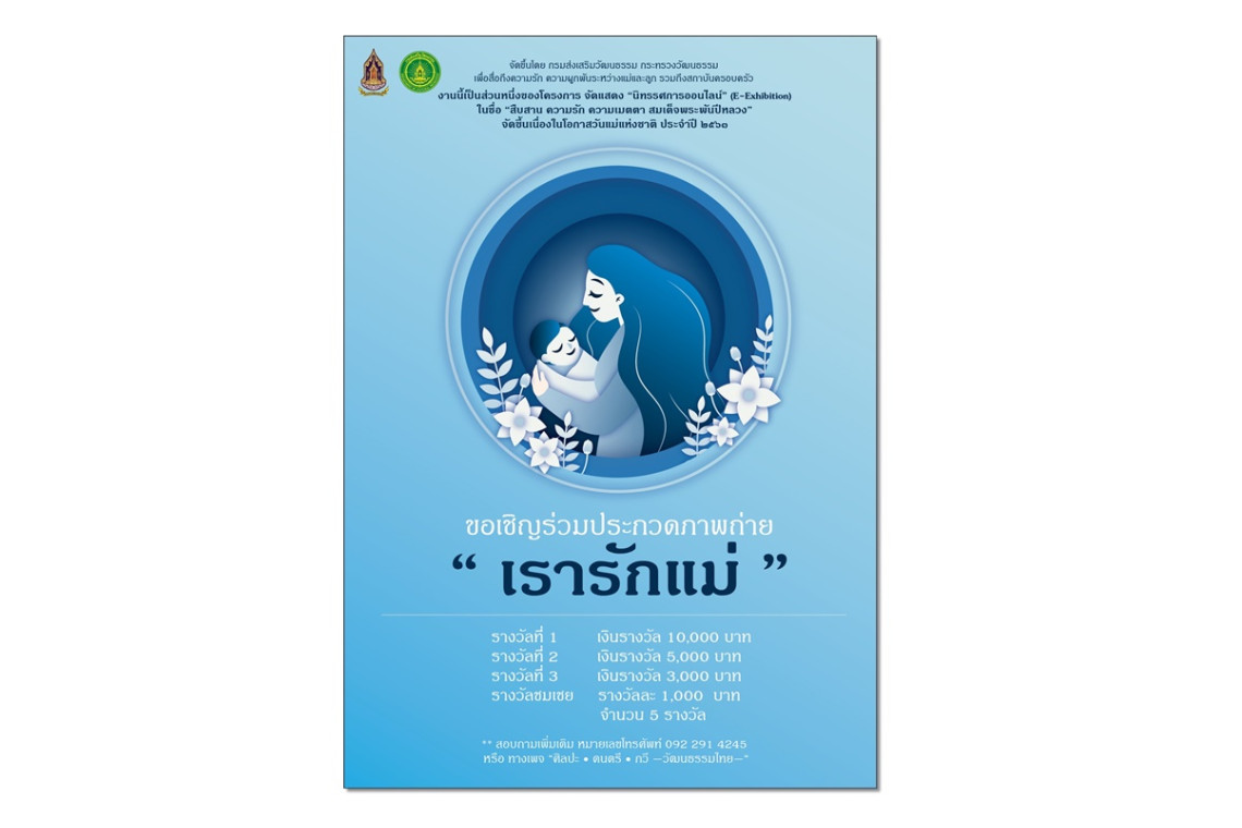 ร่วมเป็นส่วนหนึ่งในการบอกรักแม่ กับกิจกรรม “เรารักแม่” โดยกรมส่งเสริมวัฒนธรรม กระทรวงวัฒนธรรม ด้วยการส่งภาพถ่ายคู่กับแม่ สื่อถึงความรัก ความผูกพันกับกิจกรรมดีๆ เนื่องในวันแม่แห่งชาติประจำปี 2563 ได้แล้วตั้งแต่วันนี้ – 5 สิงหาคม ศกนี้ สอบถามรายละเอียดเพิ่มเติมได้ที่ โทร. 092-291-4245 หรือทางแฟนเพจ “ศิลปะ •ดนตรี • กวี — วัฒนธรรมไทย —”