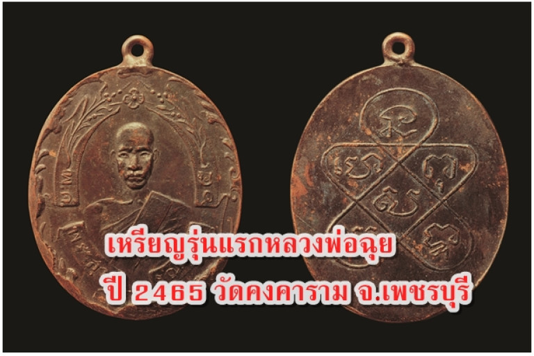 สำหรับ “เหรียญปั๊มรูปเหมือนรุ่นแรกหลวงพ่อฉุย สุขภิกฺขุ” เป็นเหรียญปั๊มรูปเหมือนรุ่นแรกและรุ่นเดียวที่สร้างในช่วงที่หลวงพ่อยังมีชีวิตอยู่ เมื่อปี พ.ศ.2465 เพื่อแจกเป็นที่ระลึกในงานฉลองมณฑป วัดคงคาราม ที่ประดิษฐานพระพุทธชินราชจำลอง พระพุทธชินสีห์จำลอง และพระศรีศาสดาจำลอง เนื้อหามวลสาร สร้างเป็นเนื้อทองแดงรมดำ