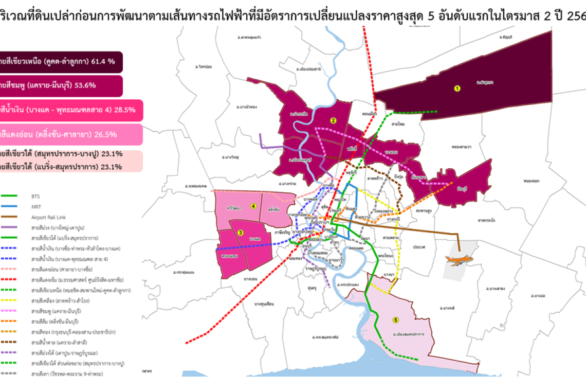 การปรับเพิ่มขึ้นของดัชนีราคาที่ดินเปล่าก่อนการพัฒนาในไตรมาสนี้ ทำเลที่มีการปรับเพิ่มขึ้นมากกว่าทำเลอื่นๆ ส่วนใหญ่ยังคงเป็นพื้นที่ปลายสายรถไฟฟ้าที่เป็นส่วนต่อขยายและมีแผนจะก่อสร้างในอนาคต โดยทำเลที่มีเส้นทางรถไฟฟ้าผ่าน 5 อันดับแรกที่มีอัตราการขยายตัวของราคาที่ดินเพิ่มขึ้นสูงสุด เมื่อเทียบกับช่วงเวลาเดียวกันของปีก่อน (YoY) ได้แก่
