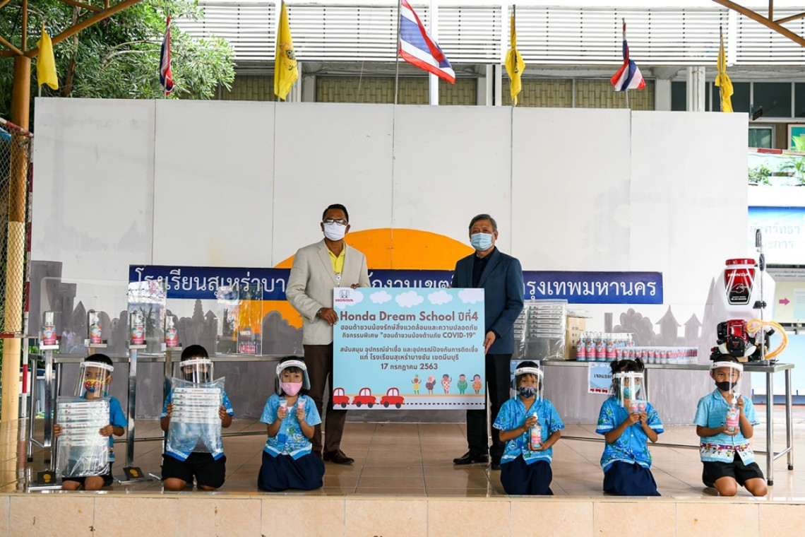 บริษัท ฮอนด้า ออโตโมบิล (ประเทศไทย) จำกัด สานต่อ โครงการ “Honda Dream School : ฮอนด้าชวนน้องรักษ์สิ่งแวดล้อมและความปลอดภัย” ซึ่งในปีนี้ได้ต่อยอดกิจกรรมในการเตรียมความพร้อมรับสถานการณ์การแพร่ระบาดเชื้อไวรัสโควิด-19 โดยได้เชิญชวนพนักงานฮอนด้าร่วมส่งต่อความห่วงใย รวมพลังอาสาร่วมกันผลิตอุปกรณ์ป้องกันเชื้อไวรัสโควิด-19 อาทิ ฉากป้องกันสำหรับติดตั้งบนโต๊ะอาหารและโต๊ะเรียนวิทยาศาสตร์ หน้ากาก Face shield แท่นเหยียบเจลแอลกอฮอล์ เจลแอลกอฮอล์แบบขวด เพื่อนำไปบริจาคและส่งมอบให้กับ 3 โรงเรียน ได้แก่ โรงเรียนสุเหร่าบางชัน กรุงเทพฯ โรงเรียนบ้านสร้าง (สำริต ภู่เงินอนุสรณ์) จ.พระนครศรีอยุธยา และโรงเรียนบ้านหว้าเอน จ.ปราจีนบุรี นอกจากนี้ ฮอนด้า ยังมอบผลิตภัณฑ์ในกลุ่มเครื่องยนต์อเนกประสงค์ของฮอนด้า ได้แก่ เครื่องพ่นยาแบบสะพายหลัง ให้กับทางโรงเรียน อีกทั้งช่วยพัฒนาสิ่งแวดล้อมและปรับปรุงภูมิทัศน์ของโรงเรียน เพื่อให้เอื้อต่อการสอนของครูและการเรียนรู้ของเด็ก พร้อมส่งต่อสังคมคุณภาพอีกด้วย จากสถานการณ์การแพร่ระบาดของเชื้อไวรัสโควิด-19 ซึ่งส่งผลต่อการเปลี่ยนแปลงรูปแบบการใช้ชีวิต ประจำวันจนเกิดเป็นวิถีใหม่ New Normal ทุกๆ สถานที่มีการกำหนดมาตรการสุขอนามัยและความปลอดภัยที่เข้มงวด รวมถึงในโรงเรียนและสถานศึกษา ฮอนด้า ภายใต้ โครงการ “Honda Dream School : ฮอนด้าชวนน้องรักษ์สิ่งแวดล้อมและความปลอดภัย” จึงร่วมเป็นส่วนหนึ่งในการสร้างความปลอดภัยให้กับครูและนักเรียน โดยได้เชิญชวนพนักงานฮอนด้า ทั้งในส่วนของสำนักงาน ส่วนการขายและบริการ โรงงาน จ.พระนครศรีอยุธยา และโรงงาน จ.ปราจีนบุรี ร่วมผลิตอุปกรณ์ป้องกันเชื้อไวรัสโควิด-19 ในบริเวณ “พื้นที่ปันสุข” ซึ่งได้แก่ ฉากป้องกันสำหรับติดตั้งบนโต๊ะอาหารและโต๊ะเรียนวิทยาศาสตร์ 46 ชุด แท่นเหยียบเจลแอลกอฮอล์ล้างมือ 35 แท่น หน้ากาก Face shield 100 ชิ้น รวมถึงร่วมบรรจุเจลแอลกอฮอล์ล้างมือแบบหลอด 300 หลอดและแบบขวด 250 ขวด นอกจากนี้ ฮอนด้ายังได้มอบเครื่องพ่นยาแบบสะพายหลัง Honda เพื่อใช้สำหรับพ่นฆ่าเชื้อ โดยมอบให้กับโรงเรียน 3 แห่ง ได้แก่ โรงเรียนสุเหร่าบางชัน กรุงเทพฯ โรงเรียนบ้านสร้าง (สำริต ภู่เงินอนุสรณ์) จ.พระนครศรีอยุธยา และโรงเรียนบ้านหว้าเอน จ.ปราจีนบุรี