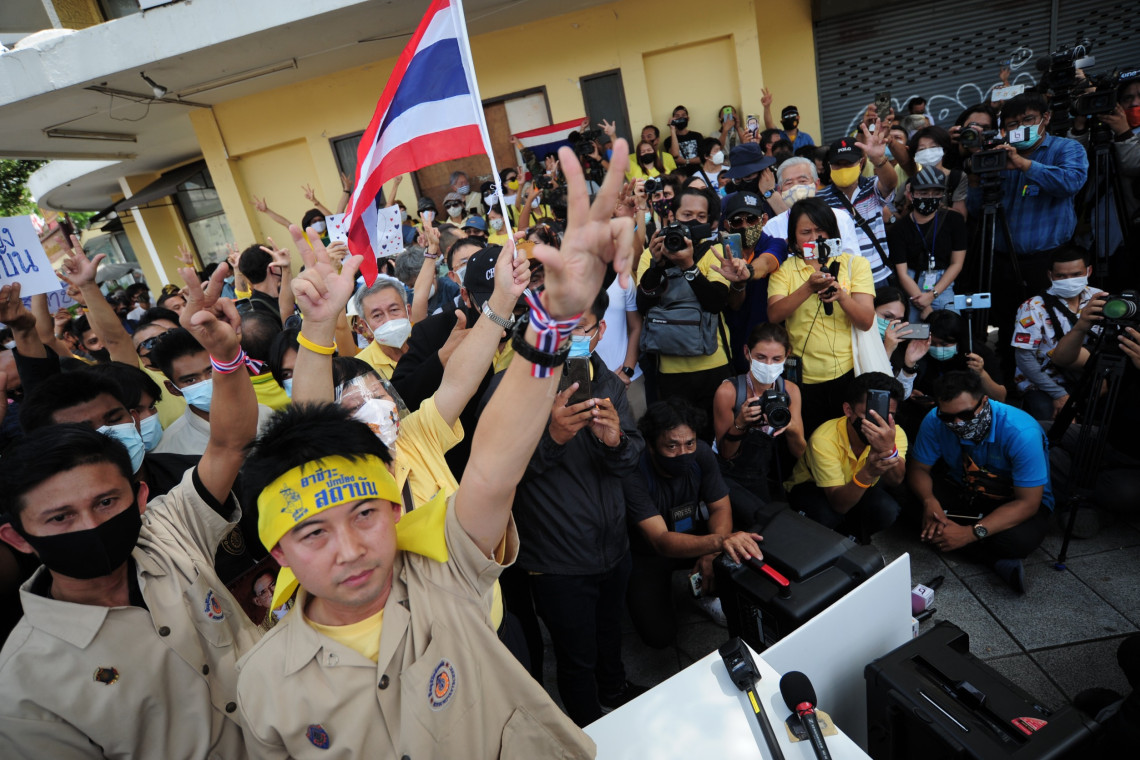 กลุ่มอาชีวะช่วยชาติ แถลงการณ์อัด เยาวชนปลดแอก ท้าทาย ต่อต้าน ล้มล้างสถาบันทางตรงและทางอ้อม แพร่เฟคนิวส์งปลุกระดมให้เกิดความเข้าใจผิดต่อสถาบัน เกรงเกิดการเผชิญหน้า กลุ่มอาชีวะช่วยชาติ เคลื่อนไหวกลับ ให้ข้อมูลเรื่องสถาบันที่ถูกต้องต่อสังคม พร้อมชู 3 นิ้ว ชาติ ศาสน์ กษัตริย์ เมื่อเวลา 14.00 น. ของวันนี้ (30 ก.ค.) ที่อนุเสาวรีย์ประชาธิปไตย กลุ่มอาชีวะช่วยชาติ รวมพลังปกป้องสถาบัน ชาติศาสน์กษัตริย์ รวมกลุ่มชุมนุมกันที่บริเวณอนุเสาวรีย์ประชาธิปไตย ถนนราชดำเนิน พร้อมแสดงจุดยืนขอให้ทุกฝ่ายหยุดก้่วล่วงสถาบัน พร้อมสับเปลี่ยน เปิดเพลงปลุกใจ ขณะที่แกนนำประกาศ ขอชุมนุมอย่างสงบ ภายใต้ พ.ร.ก.ฉุกเฉินฯ ท่ามกลางการรักษาความปลอดภัย ของเจ้าหน้าที่ตำรวจทั้งในและนอกเครื่องแบบ จากนั้น นายทศพล มนูญญรัตน์ ตัวแทนกลุ่มอาชีวะช่วยชาติ อ่านแถลงการณ์ “เพื่อประชาธิปไตยด้วยใจจงรักภักดี” จากกรณีที่กลุ่มเยาวชนปลดแอก และ สหภาพนักเรียน นิสิต นักศึกษา แห่งประเทศไทย หรือ สนท. จัดกิจกรรมทางการเมืองขึ้น ตั้งแต่ 18ก.ค.2563 ซึ่งต่อมาได้มีการจัดกิจกรรมในลักษณะเช่นเดียวกันนี้ หลายพื้นที่ทั่วประเทศ โดยกิจกรรมดังกล่าวแม้จะยื่นข้อเรียกร้องให้นายกรัฐมนตรีลาออกและยุบสภา แก้ไขรัฐธรรมนูญ ให้เป็นประชาธิปไตย แต่ปรากฏหลักฐานและข้อเท็จจริงว่ามีการแสดงออกเพื่อ ต้องการ ท้าทาย ต่อต้าน หรือล้มล้างสถาบันพระมหากษัตริย์ทั้งโดยทางตรงและทางอ้อม อีกทั้งยังมีการนำข้อมูลอันเป็นเท็จหรือเฟคนิวส์เพื่อปลุกระดมให้เกิดความเข้าใจผิดต่อสถาบันพระมหากษัตริย์ ซึ่งสิ่งเหล่านี้ไม่เกี่ยวข้องกับข้อเรียกร้องวัตถุประสงค์ของการ ชุมนุมเพื่อขับไล่ พล.อ.ประยุทธ์ จันทร์โอชา และรัฐบาลแต่อย่างใด อีกทั้งเป็นการชุมนุมที่ศูนย์ทุกอย่างที่จะก่อให้เกิดความขัดแย้งรุนแรงขึ้นในสังคม แต่กระนั้นทางแกนนำการชุมนุมกลับบ่ายเบี่ยงปฏิเสธโดยยืนกรานไม่รู้ไม่เห็นกับหลักฐานและข้อเท็จจริงดังกล่าว ซึ่งการกระทำที่ท้าทายและต่อต้านสถาบันพระมหากษัตริย์ดังกล่าวนี้ได้สร้างความสับสนและความกังวลให้กับประชาชนทั่วไปกว้างว่าจะส่งผลต่อการควบคุมสถานการณ์แพร่ระบาดของเชื้อโควิด-19 ซึ่งประชาชนทั่วประเทศได้ให้ความร่วมมือร่วมใจกันแก้ปัญหาได้อย่างมีประสิทธิภาพ จนเป็นที่ประจักษ์ไปทั่วโลก ทางกลุ่มอาชีวะช่วยชาติซึ่งมีความจงรักภักดีและเห็นว่าชาติ ศาสน์ กษัตริย์ ยังเป็นหมุดหมายที่สำคัญของระบอบประชาธิปไตยอันมีพระมหากษัตริย์ทรงเป็นประมุข จึงขอแสดงความห่วงใยต่อสถานการณ์การชุมนุ