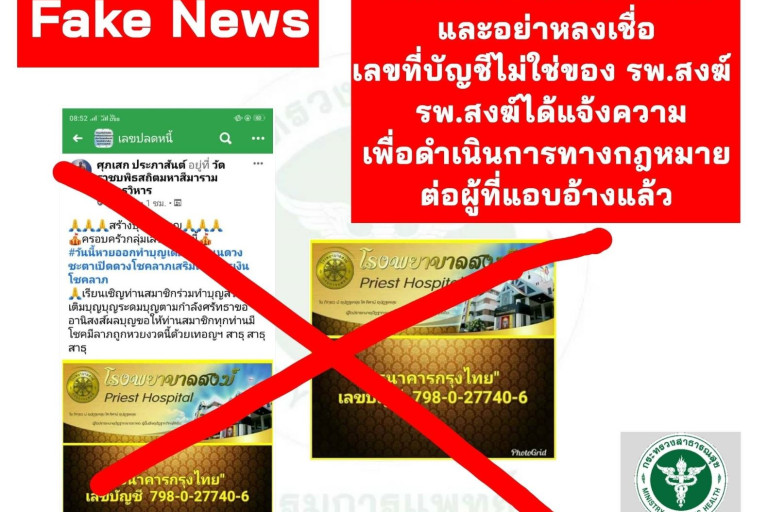 1 สิงหาคม 2563 16:33 น. สยามรัฐออนไลน์ คุณภาพชีวิต กรมการแพทย์ กระทรวงสาธารณสุข โพสต์ผ่านเฟซบุ๊กระบุ ข่าวปลอม ไม่ควรแชร์ต่อ อย่าหลงเชื่อ เลขที่บัญชีไม่ใช่ของ รพ.สงฆ์ ซึ่งทางรพ.สงฆ์ได้แจ้งความเพื่อดำเนินการทางกฎหมายต่อผู้ที่แอบอ้างแล้ว
