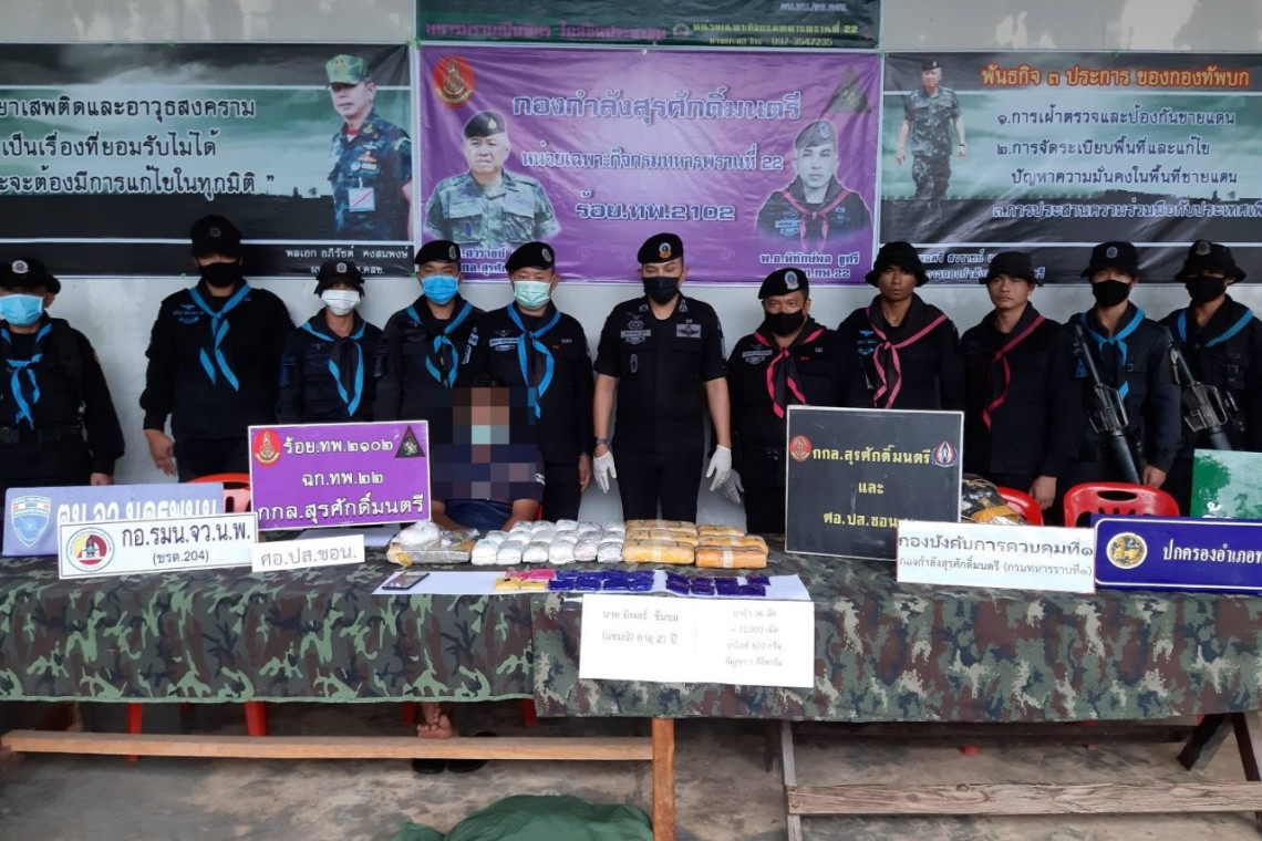 วันที่ 1 ส.ค. 2563 พ.อ.พิทักษ์พล ชูศรี ผบ.ฉก.ทพ.21 กรมทหารพรานที่ 22 พร้อมเจ้าหน้าที่ ชุดปฏิบัติการ ร้อย ทพ.2102 พร้อมหน่วยงานความมั่นคงในพื้นที่ โดยการอำนวยการของ พล.ต.สวราชย์ แสงผล ผบ.กกล.สุรศักดิ์มนตรี ร่วมกันแถลงจับกุม นายนิพลธ์ ชื่นชม อายุ 21 ปี ราษฎร บ.ท่าหนามแก้ว อ.ท่าอุเทน จ.นครพนม พร้อมของกลาง ยาเสพติดให้โทษประเภท 1 (ยาบ้า) จำนวน 72,000 เม็ด ,ไอซ์ จำนวน 0.5 กิโลกรัม ,กัญชา จำนวน 1 กิโลกรัม เหตุเกิดบริเวณ บ้านท่าหนามแก้ว ต.หนองเทา - บ้านโนนสวรรค์ ต.พะทาย อ.ท่าอุเทน จ.นครพนม