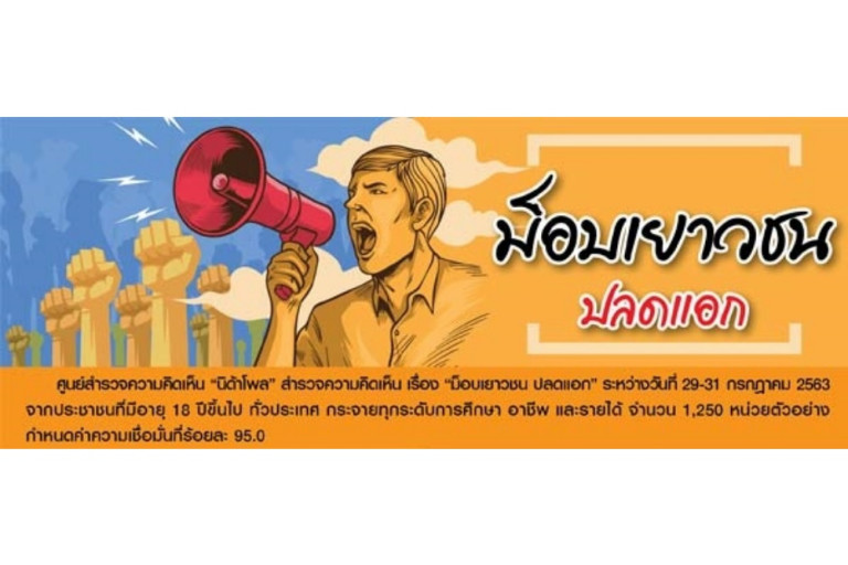 “นิด้าโพล” เผยผลสำรวจความคิดเห็นประชาชนทั่วประเทศ จำนวน 1,250 หน่วยตัวอย่าง เรื่อง “ม็อบเยาวชน ปลดแอก” ทำการสำรวจระหว่างวันที่ 29 – 31 กรกฎาคม 2563 เมื่อถามถึงความคิดเห็นของประชาชนต่อการชุมนุมของกลุ่มเยาวชนปลดแอก ที่อนุสาวรีย์ประชาธิปไตยและในอีกหลายจังหวัด พบว่า ส่วนใหญ่ ร้อยละ 26.56 ระบุว่า เป็นสิทธิเสรีภาพในการชุมนุม หากปราศจากอาวุธและความรุนแรง รองลงมา ร้อยละ 26.16 ระบุว่า เป็นสิทธิเสรีภาพในการชุมนุม หากไม่กระทำผิดกฎหมาย ร้อยละ 18.24 ระบุว่า เป็นการชุมนุมของพลังบริสุทธิ์ ของนักศึกษา ร้อยละ 17.12 ระบุว่า เป็นการจัดชุมนุมเพื่ออนาคตของประเทศ