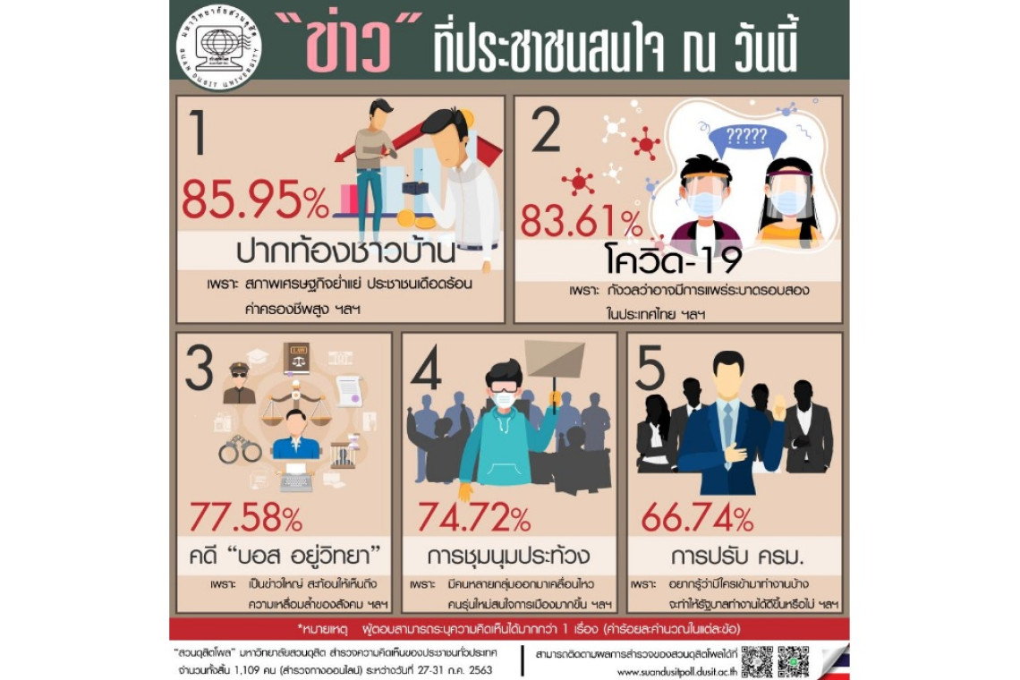 สวนดุสิตโพล มหาวิทยาลัยสวนดุสิต สำรวจความคิดเห็นของประชาชนเรื่อง “ข่าวที่ประชาชนสนใจ ณ วันนี้” กลุ่มตัวอย่าง 1,109 คน สำรวจระหว่างวันที่ 27-31 กรกฎาคม 2563 พบว่า ข่าวที่ประชาชนให้ความสนใจมากที่สุด คือ ข่าวปากท้องของประชาชน ร้อยละ 85.95 รองลงมาคือ โควิด-19 ร้อยละ 83.61 คดี บอส อยู่วิทยา ร้อยละ 77.58 การชุมนุมประท้วง ร้อยละ 74.72 และ การปรับ ครม. ร้อยละ 66.74 จะเห็นได้ว่า จากสภาพเศรษฐกิจในปัจจุบันที่ส่งผลต่อการดำเนินชีวิตของประชาชน ทำให้สนใจติดตามข่าวเกี่ยวกับชีวิตความเป็นอยู่ของตนเองอย่างมาก นอกจากนี้ ประชาชนยังให้ความสนใจกับระบบยุติธรรมของไทยที่มีช่องโหว่ให้เห็นว่ามีความสองมาตรฐานเกิดขึ้นในคดีของทายาทตระกูลดัง อีกทั้งข่าวการชุมนุมประท้วงแบบแฟลชม็อบที่ก่อตัวขึ้นเป็นระยะๆ รวมถึงรายชื่อ ครม. ที่ปรับใหม่ จึงเป็นภาพที่สะท้อน ให้เห็นว่าประชาชนยังจับตาดูทิศทางการทำงานของรัฐบาลอย่างใกล้ชิด และยังคงเฝ้ารอให้รัฐบาลเร่งแก้ปัญหาของประชาชนอย่างจริงจัง