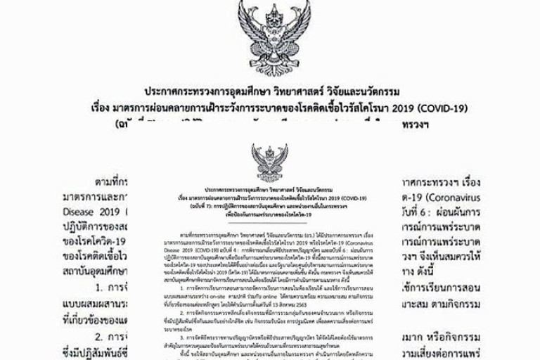 กระทรวงการอุดมศึกษา วิทยาศาสตร์ วิจัยและนวัตกรรม ประกาศ : มาตรการผ่อนคลายการเฝ้าระวังการระบาดของโรคติดเชื้อไวรัสโคโรน่า 2019 ฉบับที่ 7 โดยเห็นสมควรให้สถาบันอุดมศึกษาพิจารณาเปิดการเรียนการสอนในห้องเรียนได้ โดยใช้การเรียนการสอนแบบผสมผสานระหว่าง on-site ตามปกติ ร่วมกับ online ได้ตามความพร้อมและความเหมาะสมของแต่ละหลักสูตร เริ่มตั้งแต่ 13 ส.ค.63
