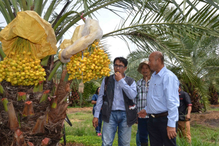 นายสถาพรกล่าวอีกว่า แรงบันดาลใจที่หันมาเลือกปลูกอินทผลัมคือ เห็นเกษตรกรหลายพื้นที่ปลูกอินทผลัมกันมากขึ้น และผลอินทผลัมเป็นที่นิยมของผู้บริโภคทุกระดับ เพราะเป็นพืชเศรษฐกิจชนิดใหม่ จึงมองว่ามีอนาคต ราคาจำหน่ายผลผลิตสูงกว่าพืชผลทั่วไป จึงได้ศึกษาหาข้อมูลเกี่ยวกับการปลูกอินทผลัม รวมทั้งการจัดการในแปลง และแนวทางการตลาด จากเกษตรกรหลายจังหวัด เช่น จ.อุดรธานี จ.เพชรบูรณ์ จ.นครราชสีมา ก่อนที่จะเริ่มทดลองปลูก ในปี 2559 ปลูกครั้งแรกเป็นสายพันธุ์เพาะเมล็ด แต่ให้ผลผลิตและคุณภาพที่ดีนัก จึงเปลี่ยนมาเป็นพันธุ์เพาะเนื้อเยื่อพันธุ์บาฮี ที่คุณภาพที่ดี ให้ผลผลิตสูง ผลโต สีเหลืองสด รสชาติหวาน กรุบกรอบ ซึ่งสามารถควบคุมเพศและคุณภาพของอินทผลัมอีกด้วย ทั้งนี้ ตนมีพื้นที่ประมาณ 20 ไร่ แบ่งเป็นพื้นที่อ้อย ขุดสระน้ำ 4 บ่อ และพืชล้มลุกชนิดต่างๆ 10 ไร่ ปลูกอินทผลัม 10 ไร่ จำนวน 250 ต้น ให้ผลผลิตเฉลี่ยต้นละ 70-100 กก.ซึ่งเก็บเกี่ยวผลผลิตจำหน่ายปีนี้เป็นปีที่ 4 ขายส่งราคา กก.ละ 250-300 บาท ขายปลีกหน้าสวน กก.ละ 350-400 บาท รายได้ เฉลี่ยวันละ 2,000-3,000 บาท รวมรายได้ปีละประมาณ 1 ล้านบาท