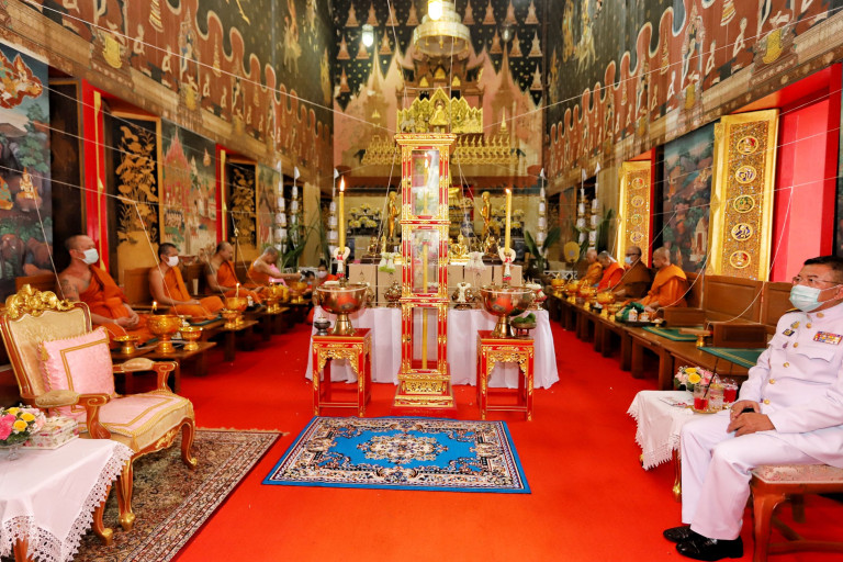 โดยมีพระมหานาคจกวัดระฆังโฆสิตราม จำนวน 4 รูป สวดพระคาถาพุทธาภิเษก จากนั้นเวลา 17.09 น.พระมงคลวโรปการ เจ้าอาวาสวัดชินวรารามวรวิหาร เป็นประธานดับเทียนชัย