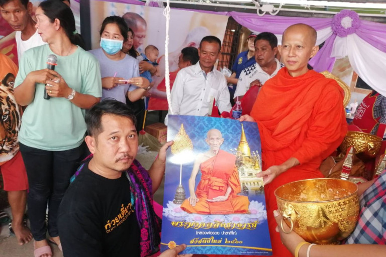 ผู้สื่อข่าวรายงานว่า หลังเสร็จสิ้นในการฉันต์ภัตราหารเพลเป็นที่เรียบร้อยท่านพระครูโสภณ สันติคุณ หรือพระอาจรย์หน่อย เจ้าอาวาสวัดหัวคุ้ง ศิษย์เอกหลวงพ่อรวย อดีตเจ้าอาวาสวัดตะโก เกจิขื่อดัง จ.อยุธยา ได้มีการนำรูปภาพและเหรียญรูปเหมือนหลวงพ่อรวย มาแจกให้แก่ผู้มาร่วมงานซึ่งแล้วแต่ผู้มีจิตศรัธาจะร่วมบริจาคทำบุญให้แก่วัดโดยไม่มีการระบุจำนวนเงิน