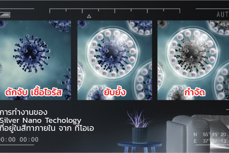 “ด้วยอนุภาค Silver Nano Technology ระดับนาโน ที่มีอยู่ในสีทาภายในของ TOA ตั้งแต่ แบรนด์สี SuperShield Duraclean A Plus,SuperShield Duraclean,TOA Shield-1 Nano,สีทนได้ สี 4SEASONS รวม 12 รุ่น ด้วยกลไกการทำงานของแร่เงินจำนวนมาก จะส่งประจุอิออน 1+ จึงทำหน้าที่เข้าดักจับ ยับยั้ง และกำจัดไวรัสตระกูลโคโรนาได้อย่างมีประสิทธิภาพและรวดเร็ว จากผลการทดสอบกับ Porcine Coronavirus (Porcine epidemic diarrhea virus;PEDV) โดยคณะเวชศาสตร์เขตร้อน มหาวิทยาลัยมหิดล”