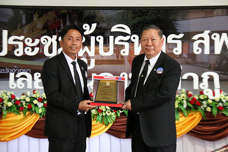 วันนี้ 27 มิ.ย.60 นายสมเจษฎ์ ศรีสมจักร์ ผู้อำนวยการสำนักงานเขตพื้นที่การศึกษามัธยมศึกษา เขต 19 แสดงความยินดีกับนายจักรพงศ์ แถลงกัณฑ์ ผู้อำนวยการโรงเรียนผาอินทร์แปลงวิทยา เนื่องในโอกาสได้รับโล่เชิดชูเกียรติเสมา ป.ป.ส. โครงการสถานศึกษาสีขาว ปลอดยาเสพติดและอบายมุข ประจำปี 2558 จากรัฐมนตรีว่าการกระทรวงศึกษาธิการ ในที่ประชุมผู้บริหารสถานศึกษาสัญจร ครั้งที่ 6 ประจำปี 2560 ที่โรงเรียนผาอินทร์แปลงวิทยา อ.เอราวัณ จ.เลย