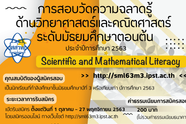ศาสตราจารย์ ดร.ชูกิจ ลิมปิจำนงค์ ผู้อำนวยการสถาบันส่งเสริมการสอนวิทยาศาสตร์และเทคโนโลยี (สสวท.) เปิดเผยว่า สสวท. เปิดรับสมัครสอบเพื่อวัดความฉลาดรู้ด้านวิทยาศาสตร์และคณิตศาสตร์ (Scientific and Mathematical Literacy) ระดับมัธยมศึกษาตอนต้น ประจำปีการศึกษา 2563 เพื่อคัดเลือกเป็นนักเรียนทุน พสวท. และนักเรียนโครงการห้องเรียน พสวท. (สู่ความเป็นเลิศ) ประจำปีการศึกษา 2564 ผู้สมัครต้องเป็นนักเรียนที่กําลังศึกษาชั้นมัธยมศึกษาปีที่ 3 หรือเทียบเท่า ปีการศึกษา 2563 สัญชาติไทย มีบัตรประจำตัวประชาชน ค่าธรรมเนียมการสมัครสอบคนละ 200 บาท กำหนดการสอบรอบที่ 1 วันที่ 26 ธันวาคม 2563 เวลา 08.00-15.30 น. วิชาที่สอบได้แก่ ความคิดสร้างสรรค์ทางวิทยาศาสตร์ วิทยาศาสตร์และการคิดวิเคราะห์ คณิตศาสตร์และการคิดวิเคราะห์ เปิดรับสมัครตั้งแต่วันที่ 1 ตุลาคม – 27 พฤศจิกายน 2563 โดยสมัครออนไลน์ที่เว็บไซต์ http://sml63m3.ipst.ac.th ตรวจสอบรายชื่อผู้มีสิทธิสอบทางเว็บไซต์เดียวกันนี้ได้ตั้งแต่วันที่ 8ธันวาคม 2563 เป็นต้นไป