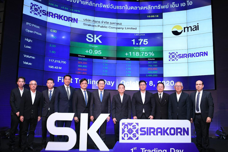 นายภากร ตั้งนุกูลกิจ กรรมการบริษัทและผู้ช่วยกรรมการผู้จัดการ บริษัท ศิรกร จำกัด (มหาชน) หรือ “SK” เปิดเผยว่า วันนี้ (8 ต.ค.) หุ้น“SK” เข้าซื้อขายในตลาดหลักทรัพย์เอ็ม เอ ไอ (mai) เป็นวันแรกเปิดทำการซื้อขายที่ระดับ 1.60 บาท เพิ่มขึ้น 100% จากราคา IPO ที่ 0.80 บาท ในหมวดวัสดุก่อสร้าง ซึ่งได้รับการตอบรับที่ดีจากนักลงทุน โดยพิจารณาจากช่วงเปิดเสนอขายหุ้นไอพีโอระหว่างวันที่ 28-30 ก.ย.ที่ผ่านมา หุ้น“SK” ได้กระแสตอบรับจากนักลงทุนเป็นอย่างมาก ถือว่าเป็นการส่งสัญญาณที่ดีของหุ้นไอพีโอน้องใหม่